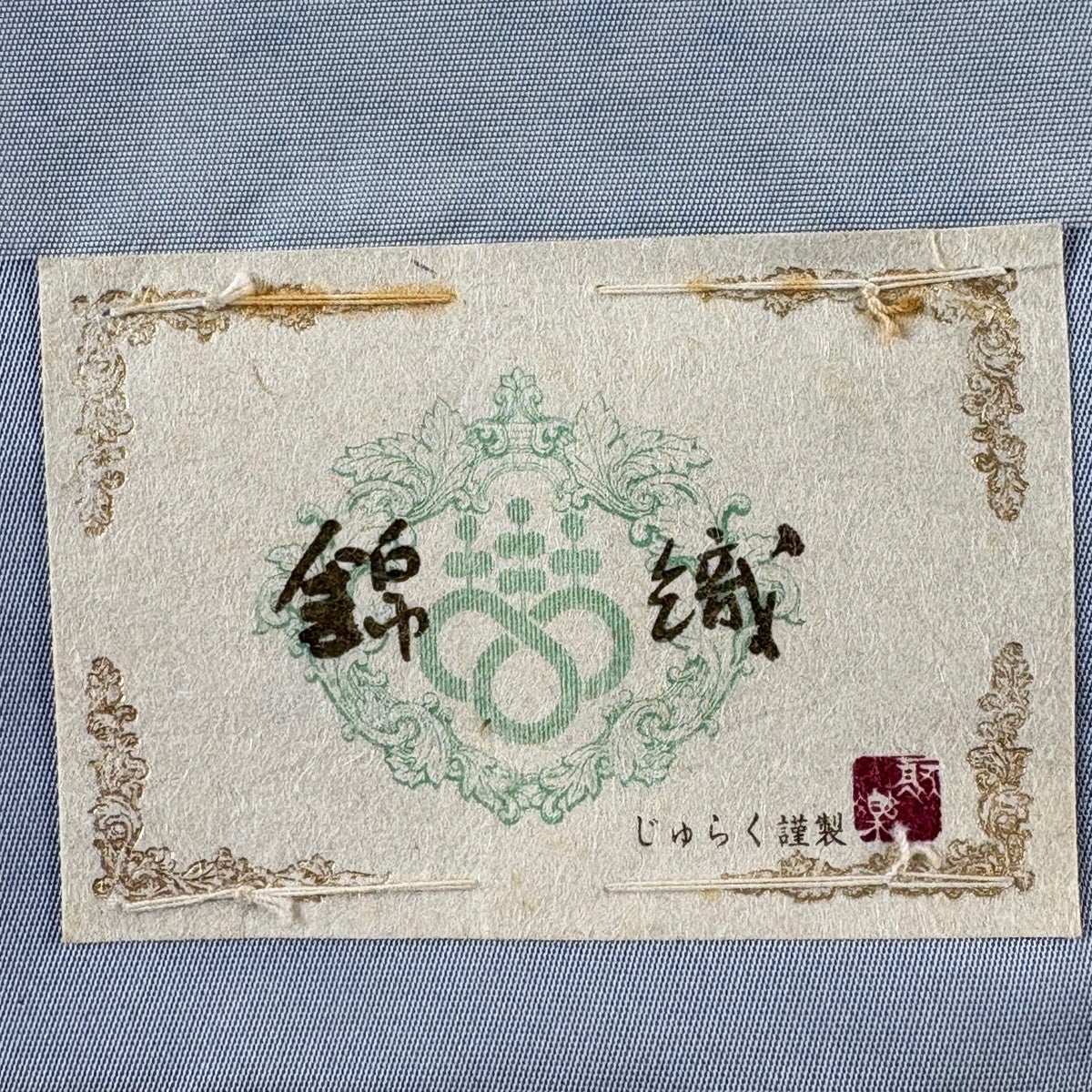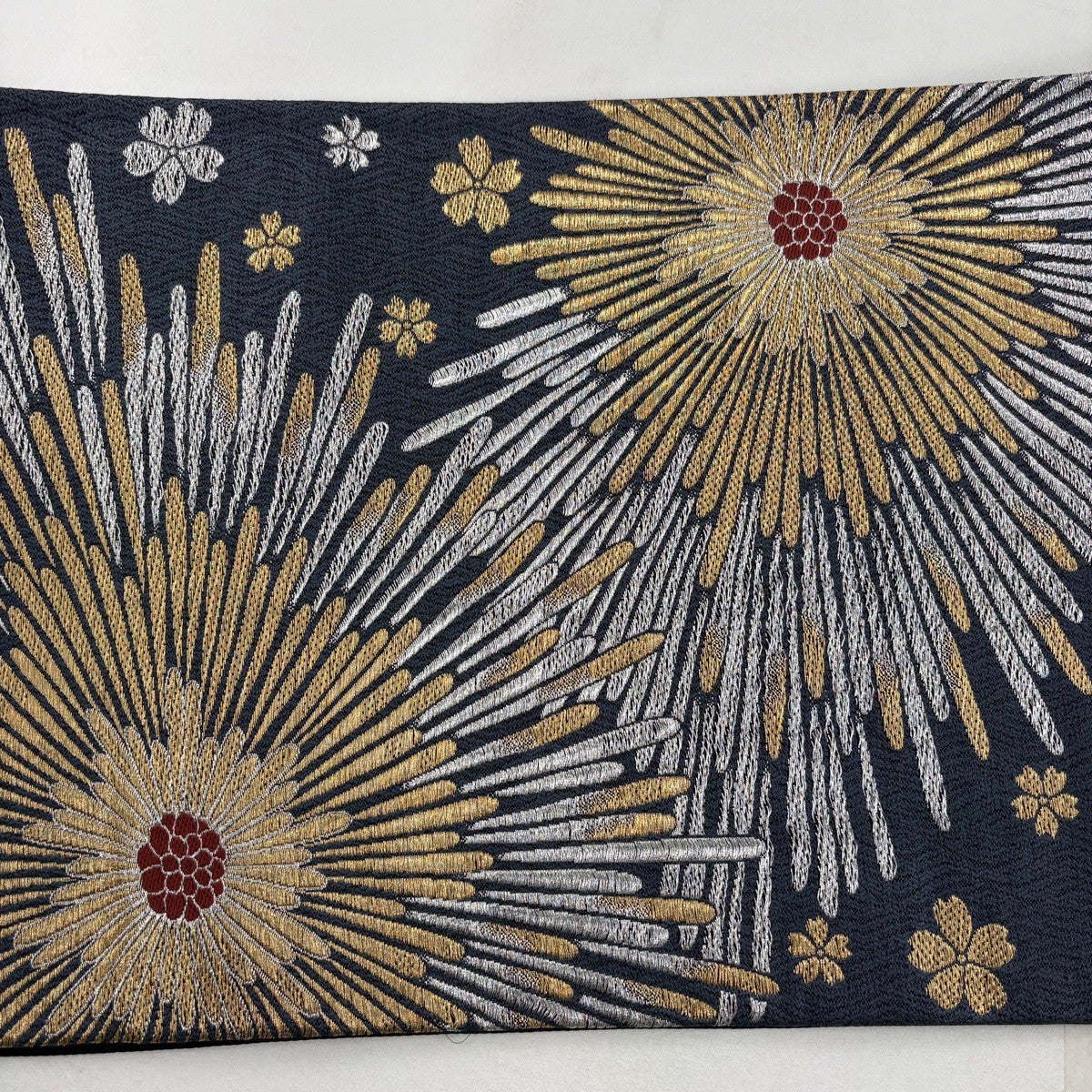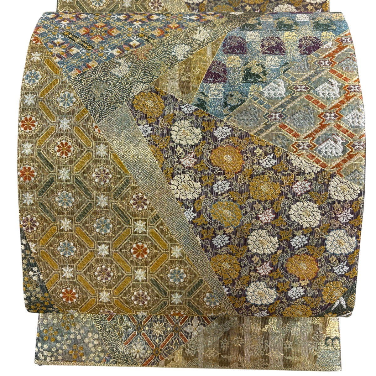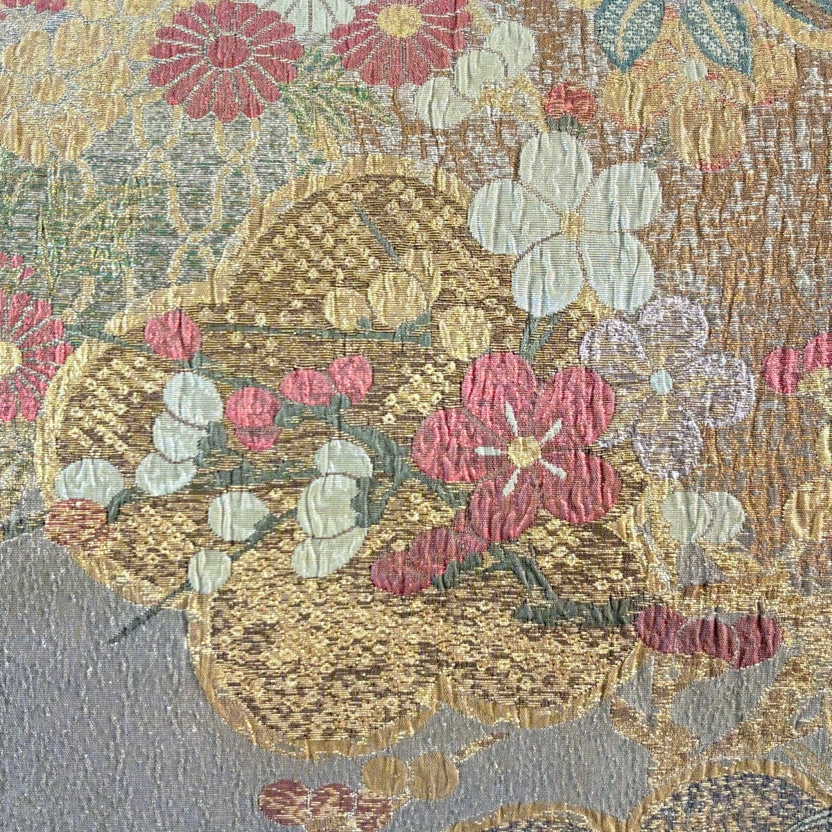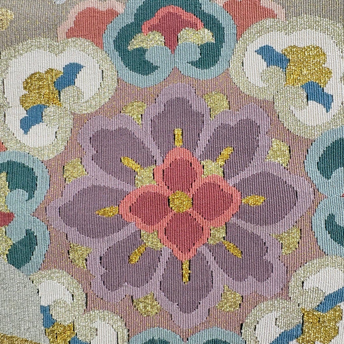 袋帯 名品 落款あり 菊 幾何学模様 金銀彩 青灰色 六通 正絹