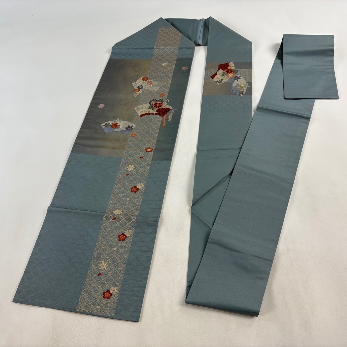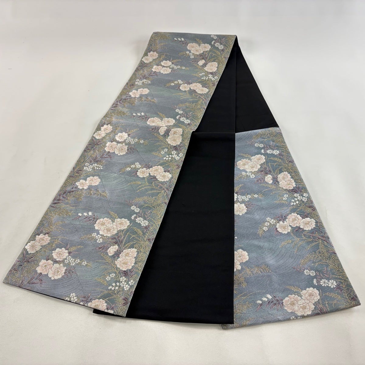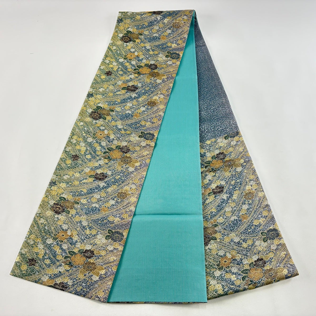 50%OFF 袋帯 秀品 花 疋田柄 青灰色 六通 正絹 K50