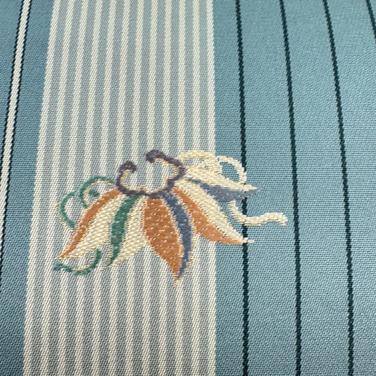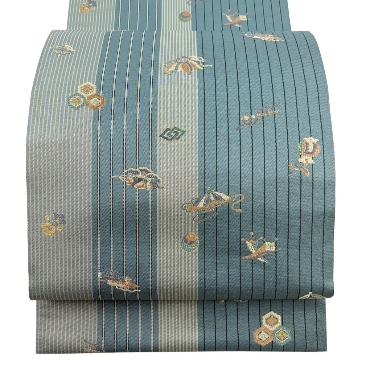 袋帯 秀品 草木染 宝尽くし 縞模様 刺繍 箔 青灰色 全通 正絹