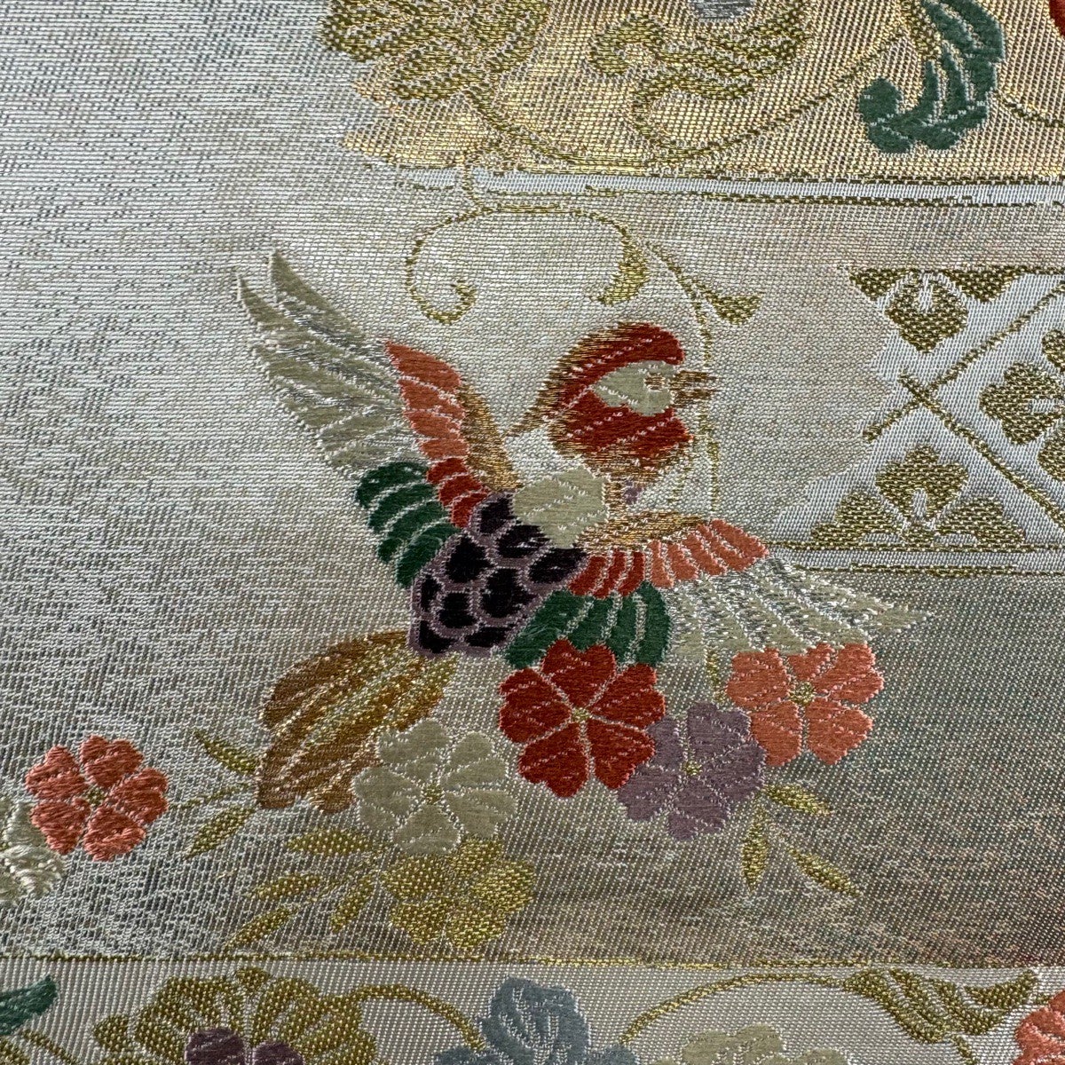 50%OFF 袋帯 秀品 花喰鳥 樹木 青灰色 六通 正絹 K50