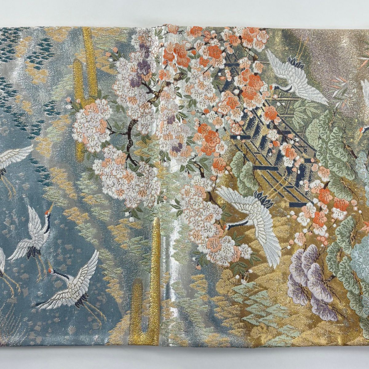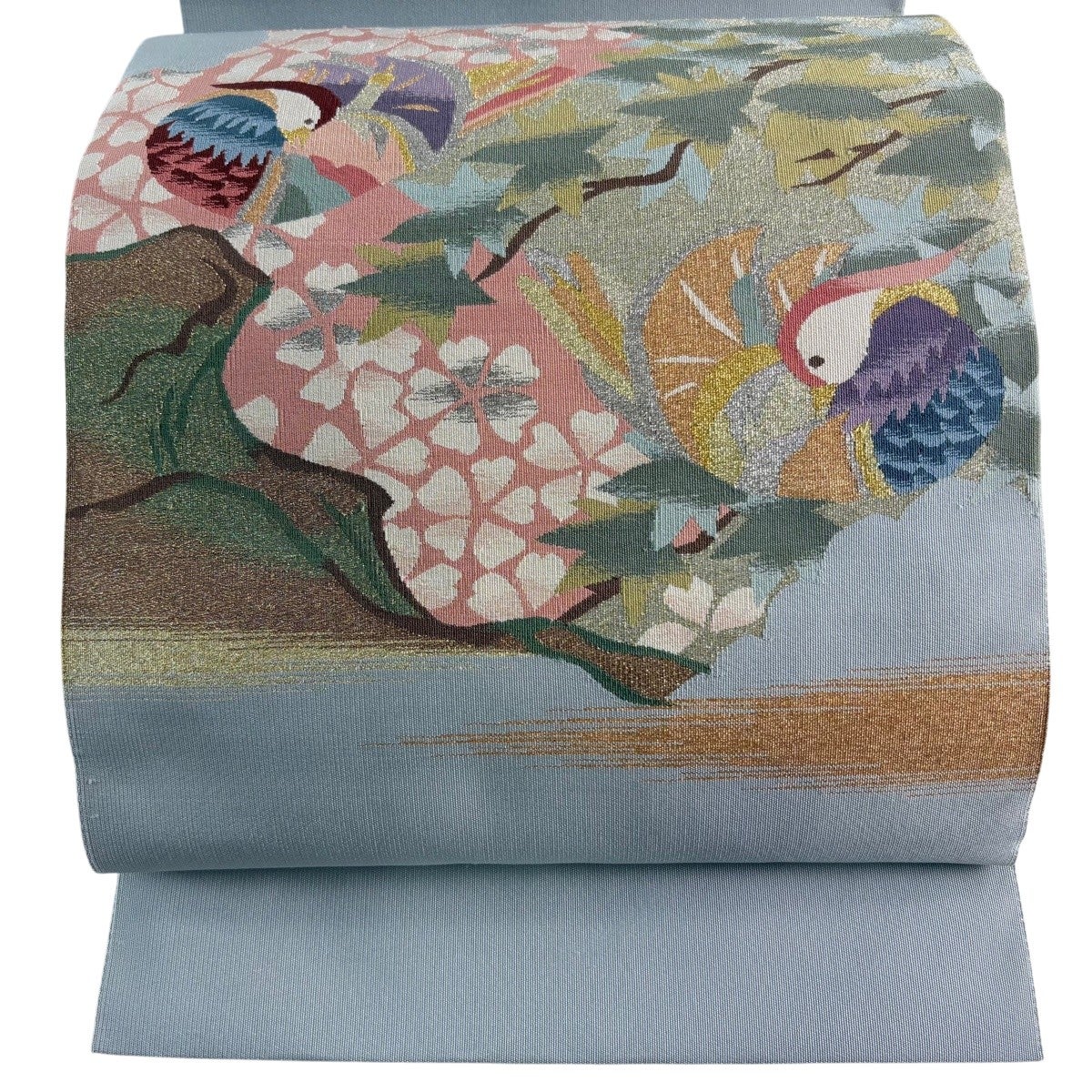 名古屋帯 優品 八寸名古屋帯 松葉仕立て 鴛鴦 桜 金銀糸 青灰色 正絹