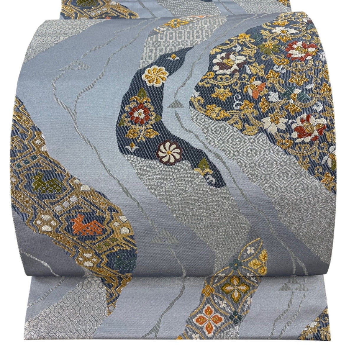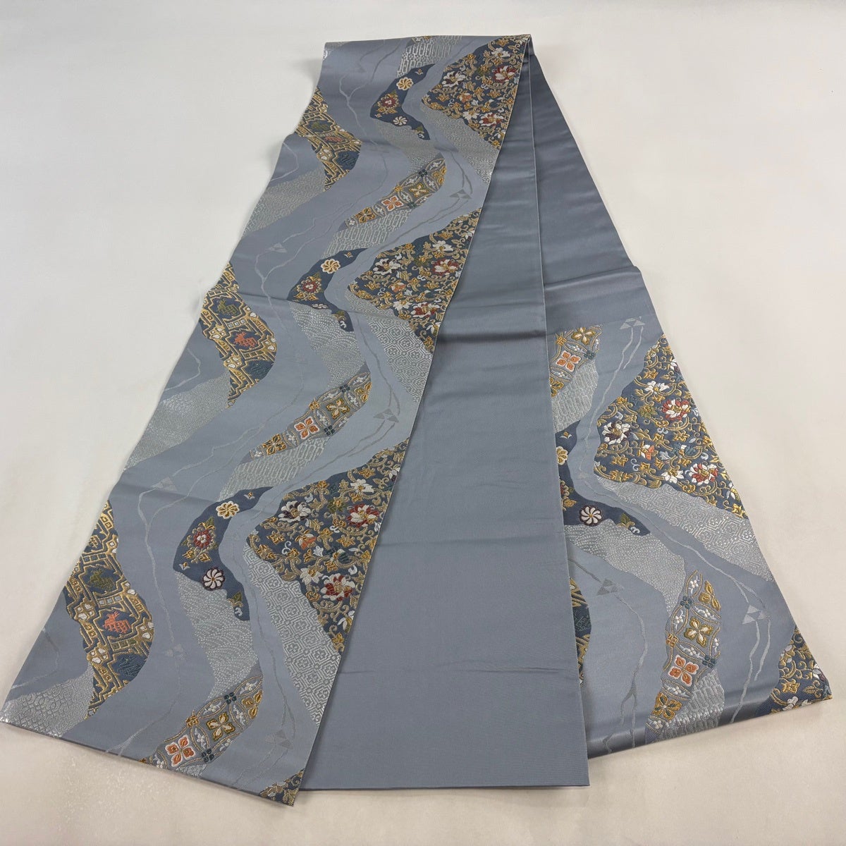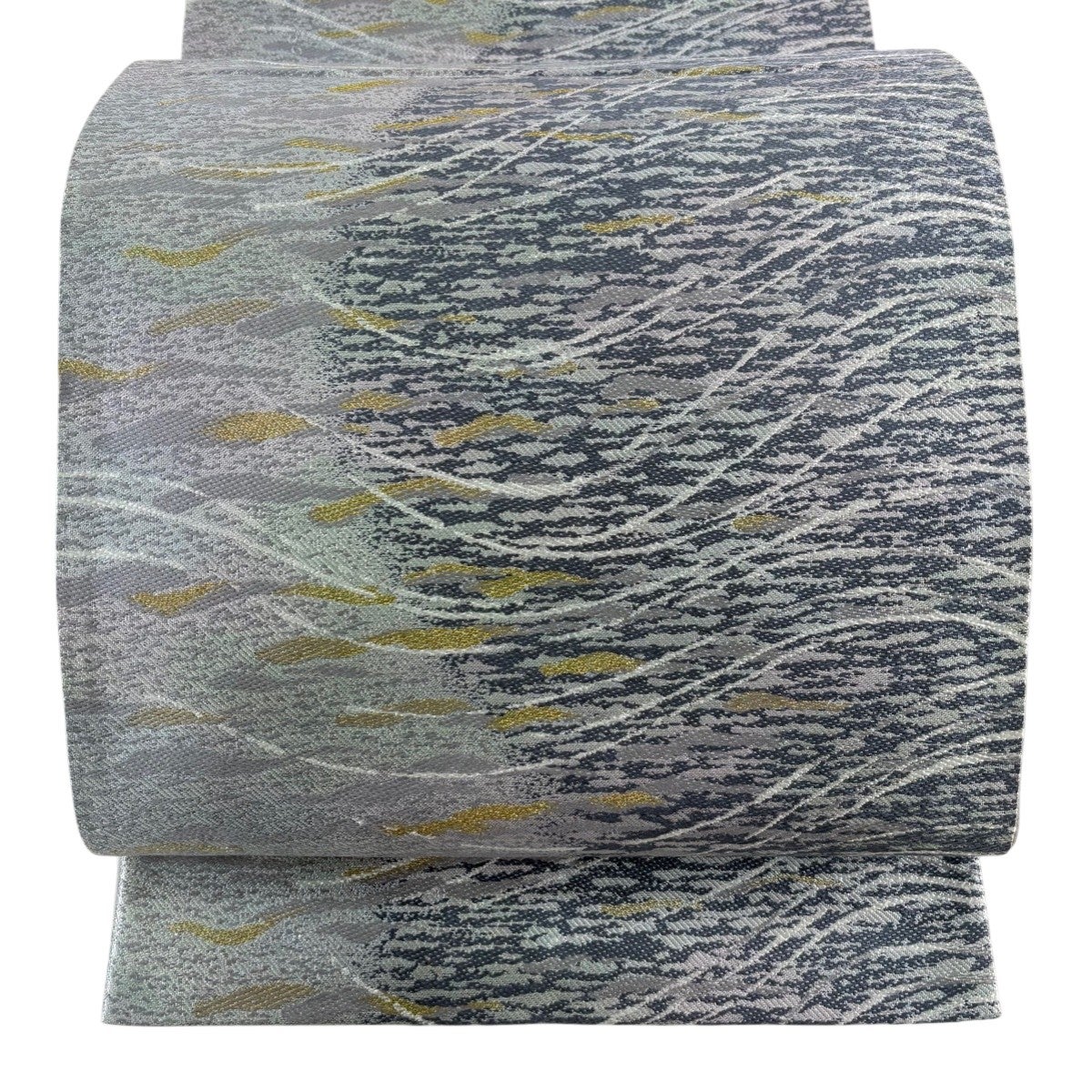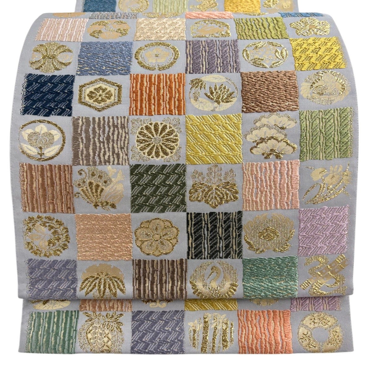 30%OFF 袋帯 秀品 草花 格子 金銀糸 青灰色 六通 正絹 K30