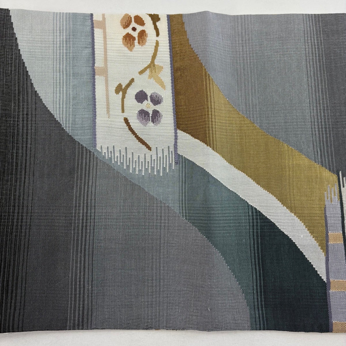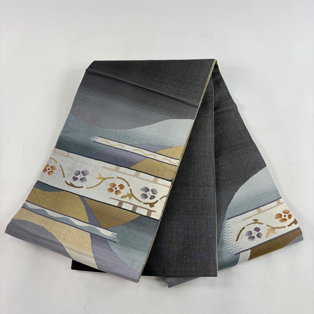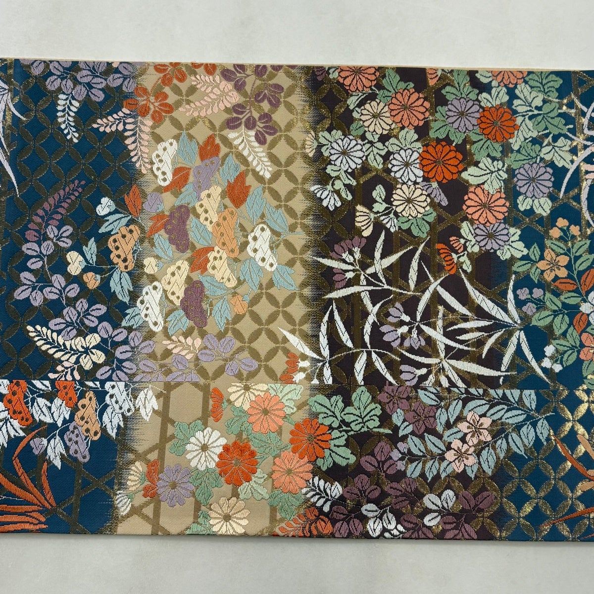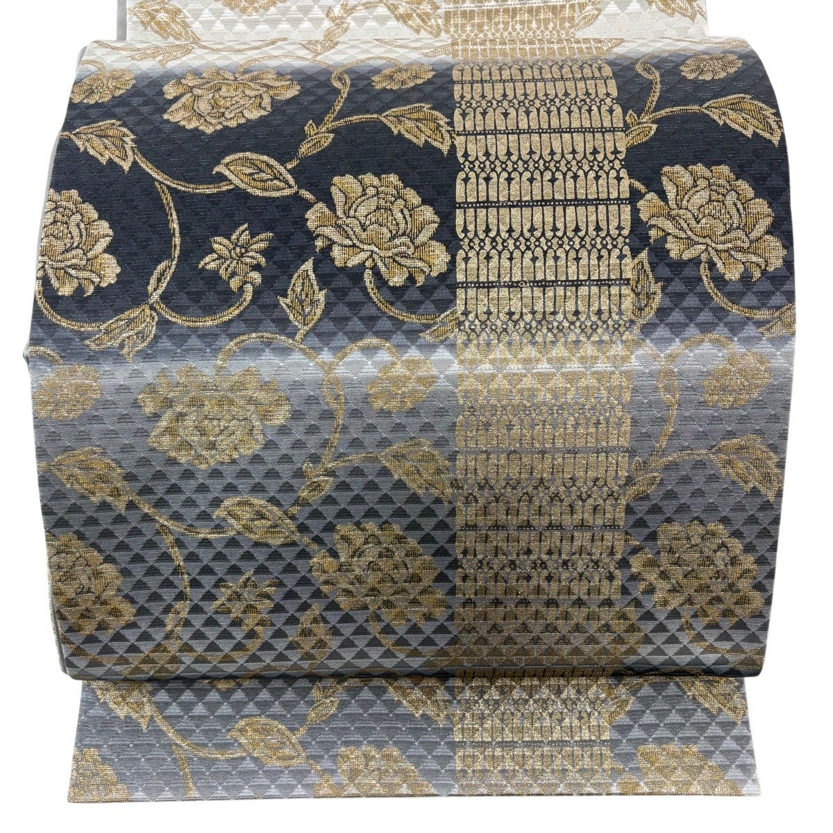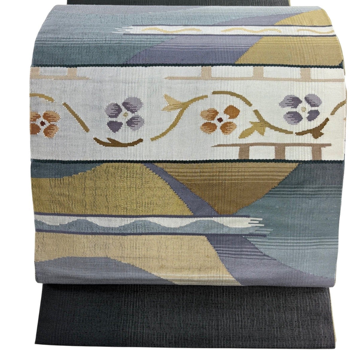 30%OFF 袋帯 秀品 草花 格子 金銀糸 青灰色 六通 正絹 K30
