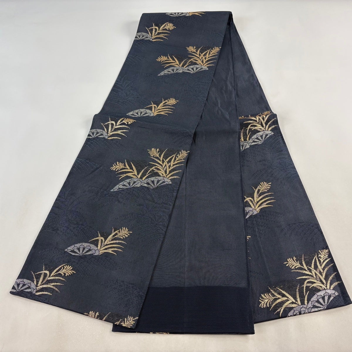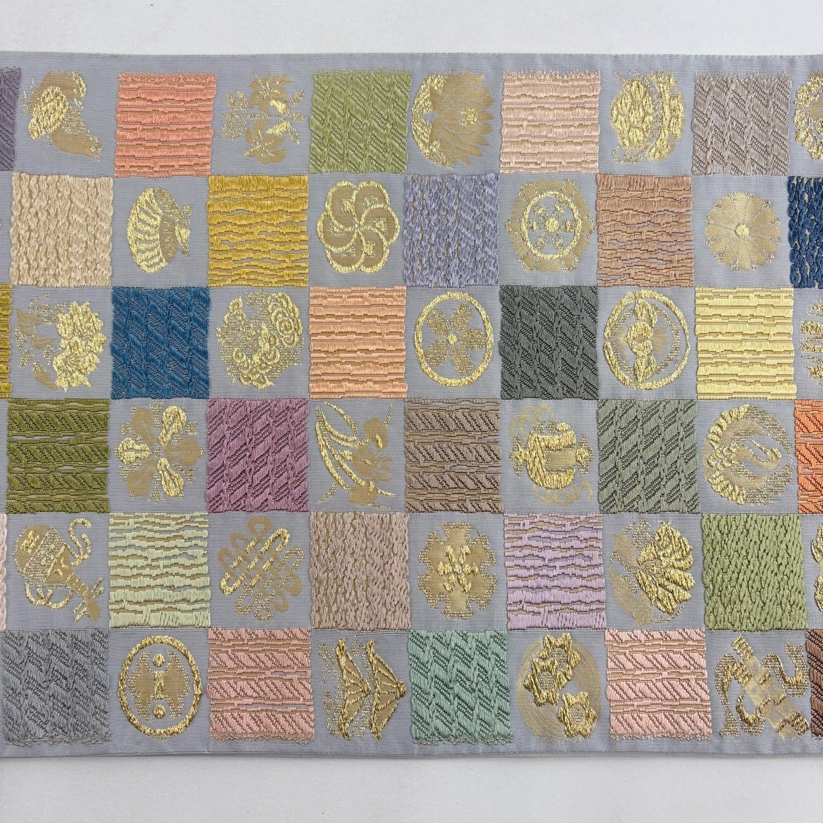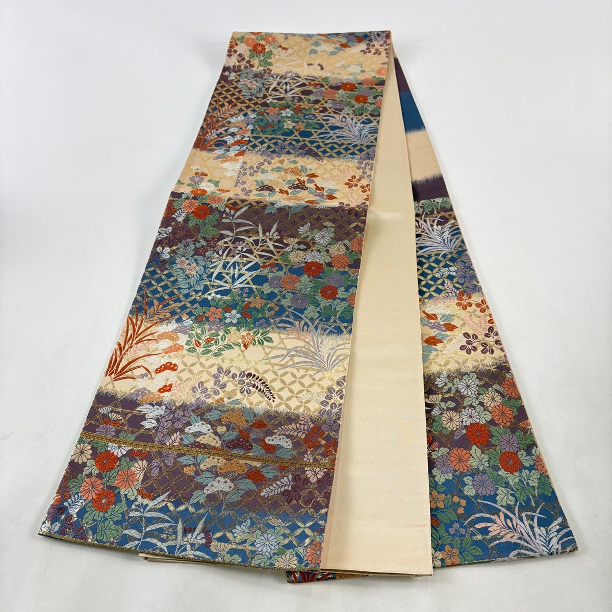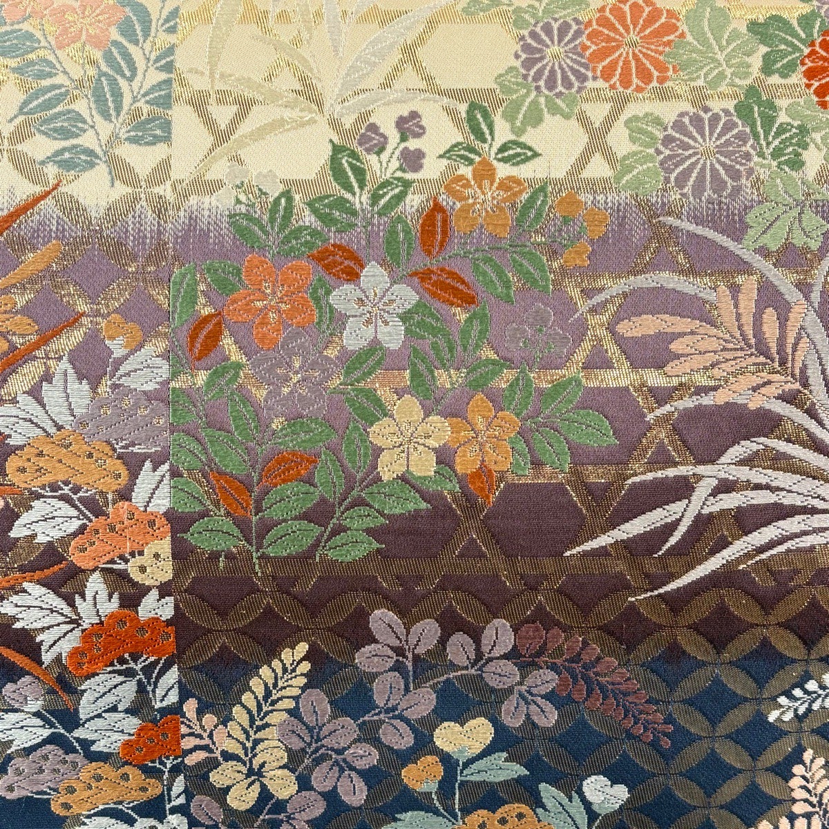 30%OFF 袋帯 秀品 草花 格子 金銀糸 青灰色 六通 正絹 K30