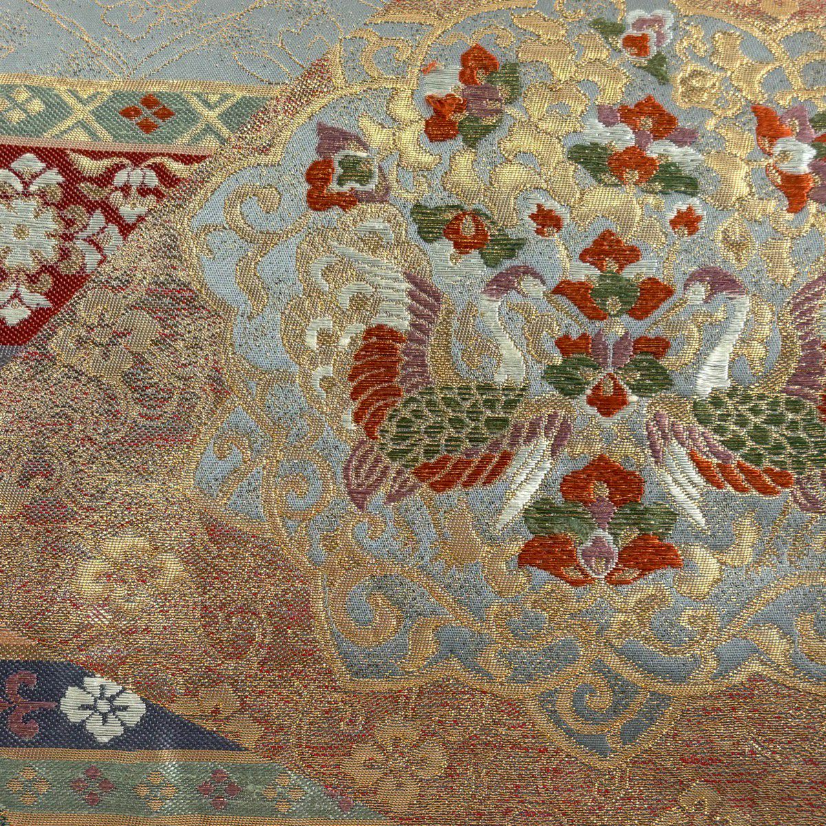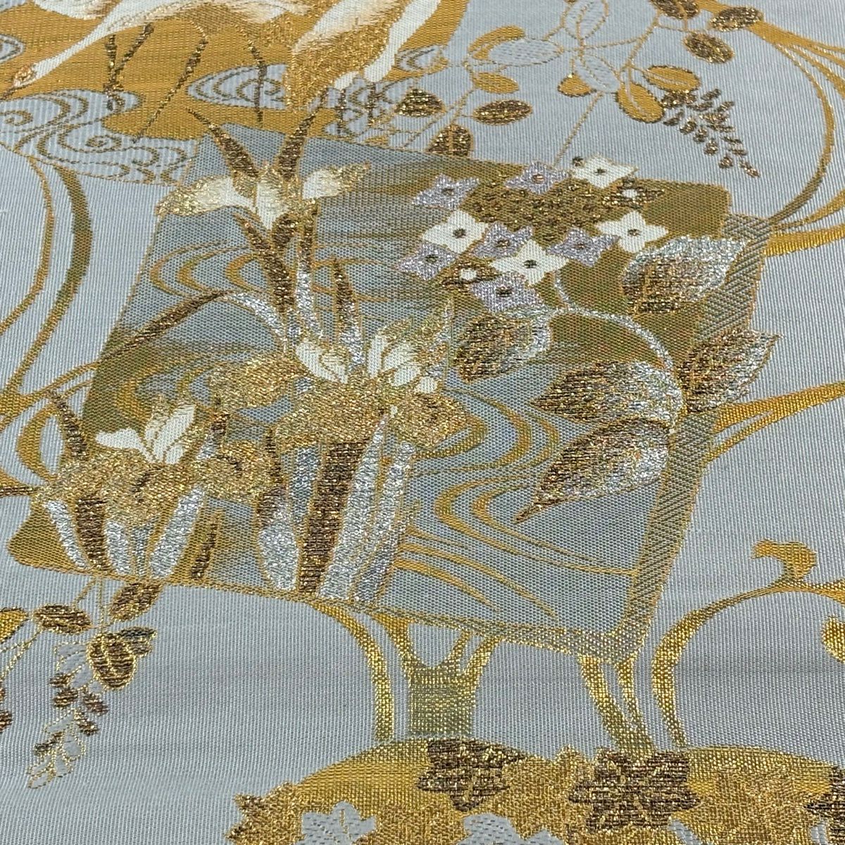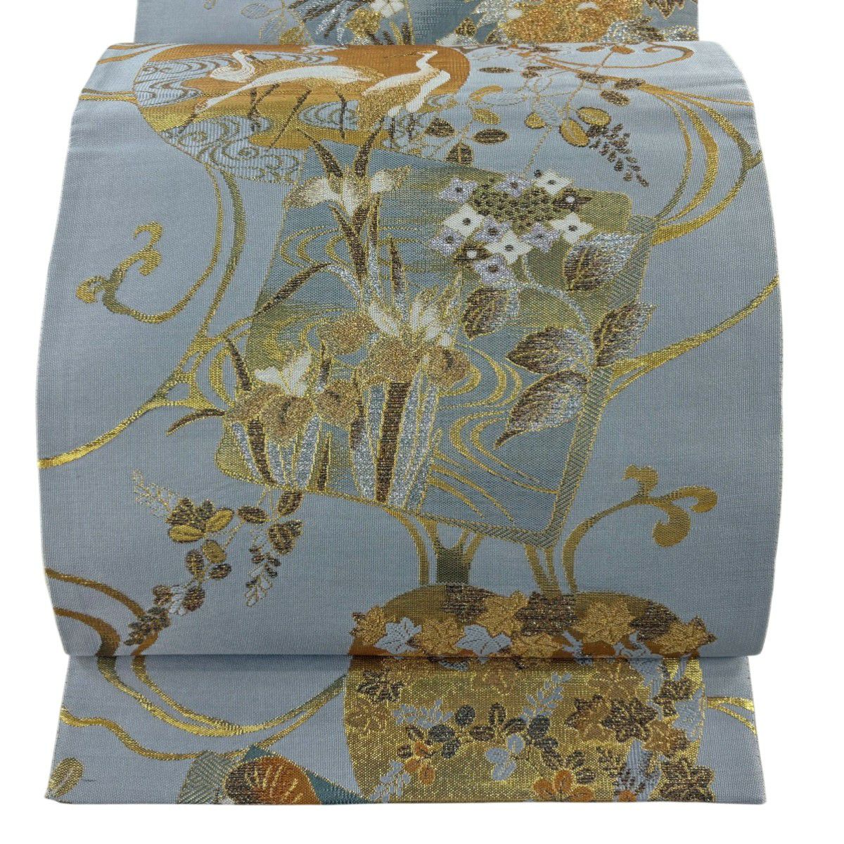 70%OFF 袋帯 秀品 菊 鳥 金糸 箔 青灰色 六通 正絹 K70