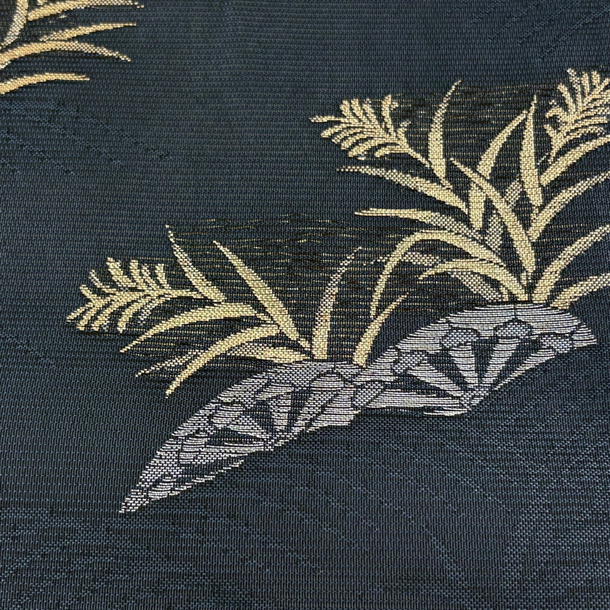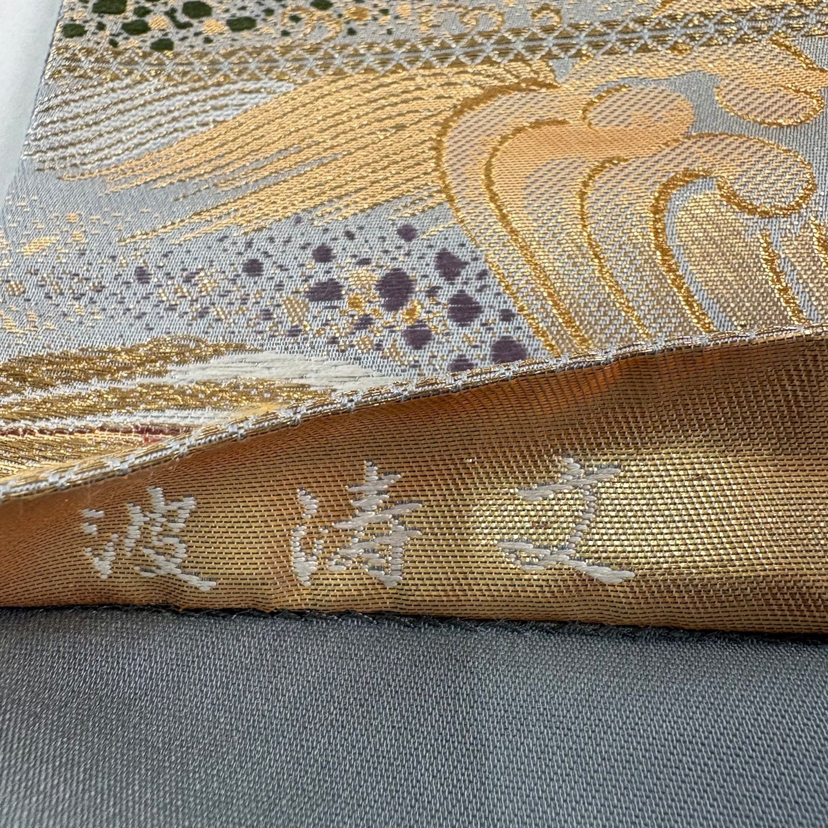 【美品】 袋帯 秀品 落款あり 草花 松皮菱 箔 青灰色 お太鼓柄 正絹