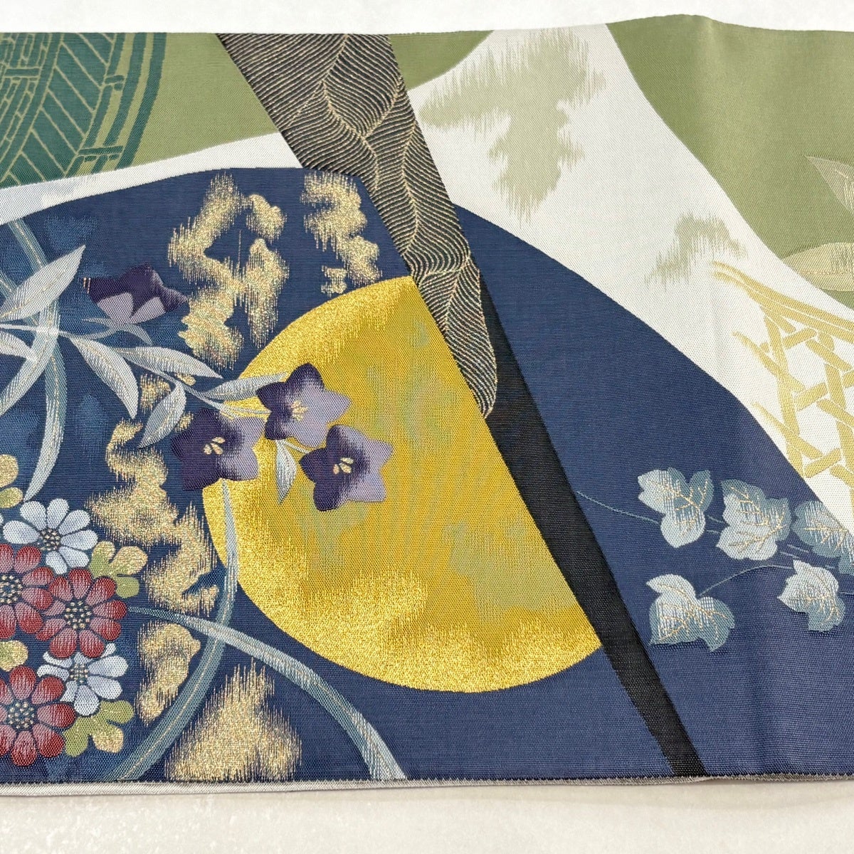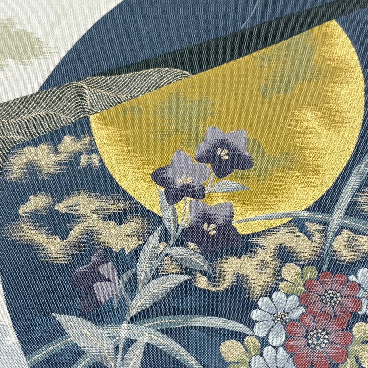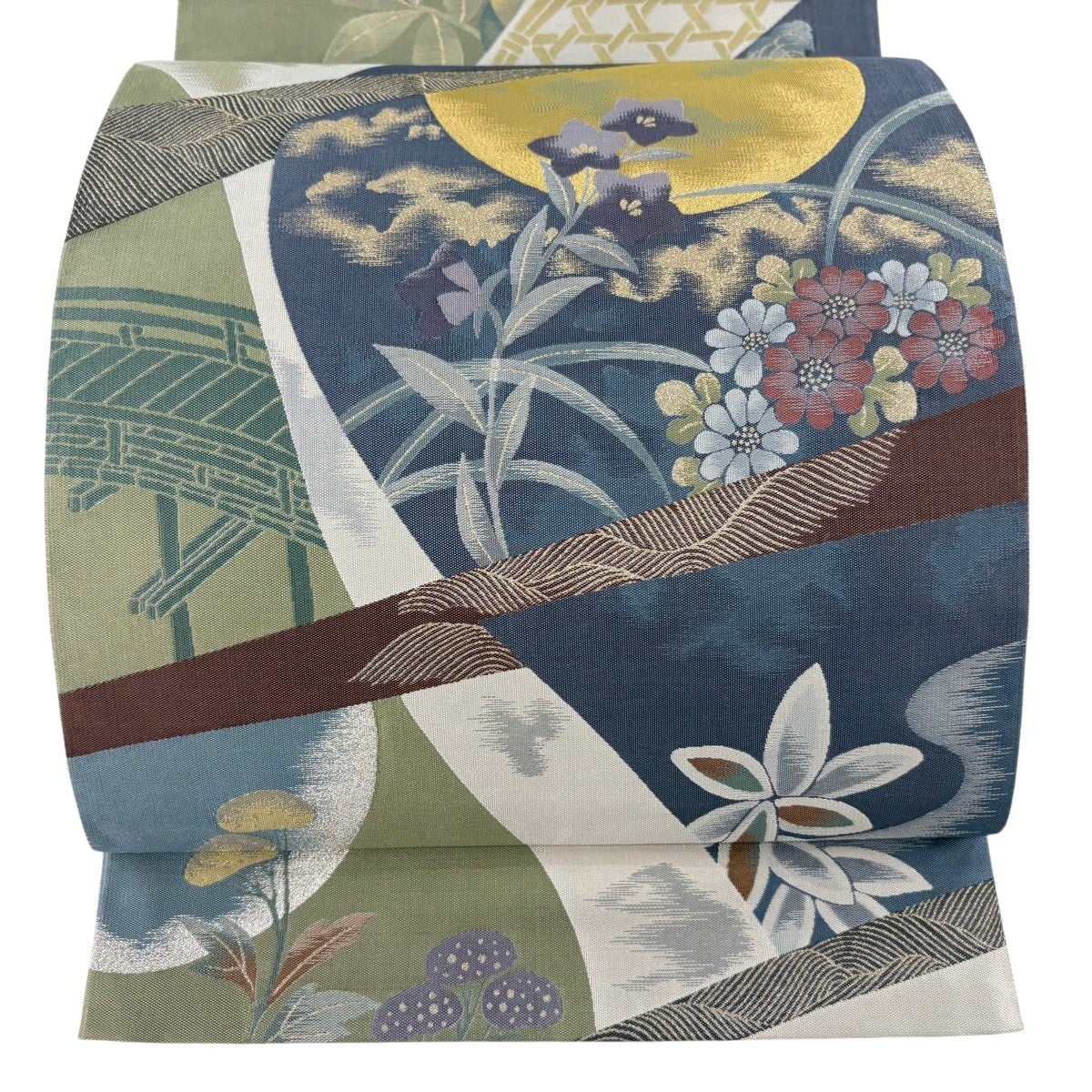袋帯 秀品 秋花彩光 風月山河 月 秋草 金糸 箔 青灰色 お太鼓柄 正絹