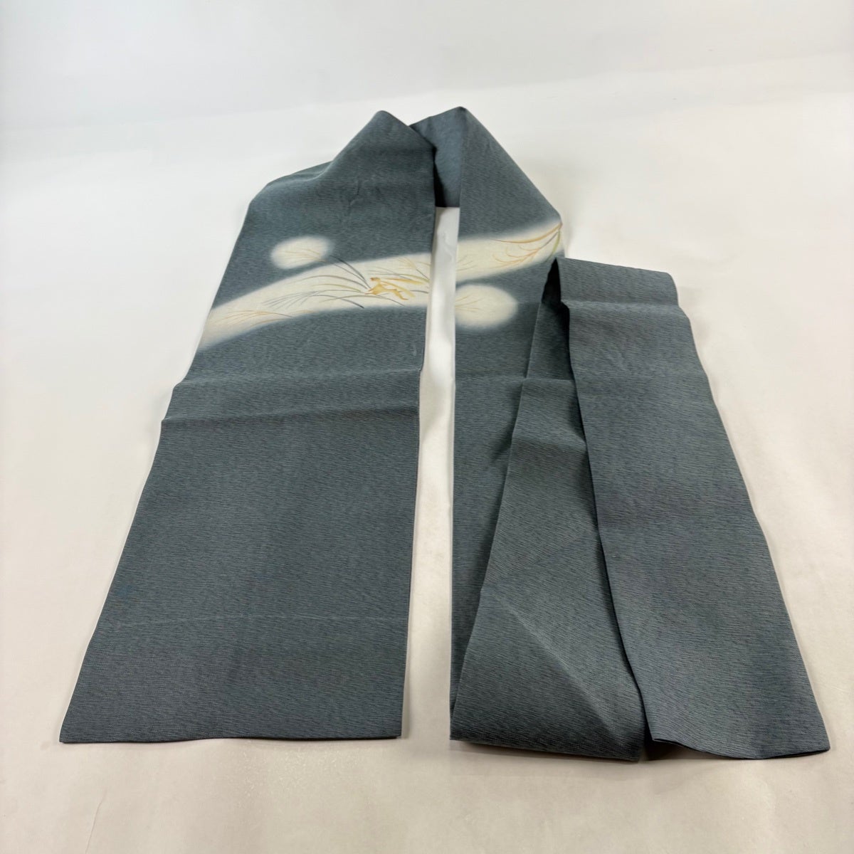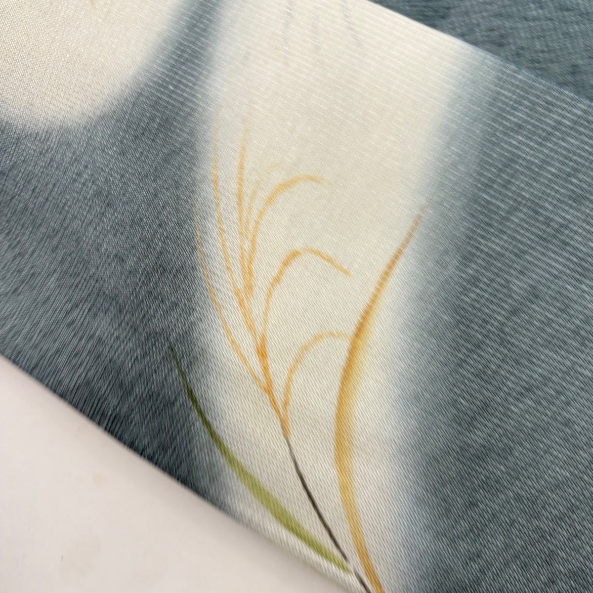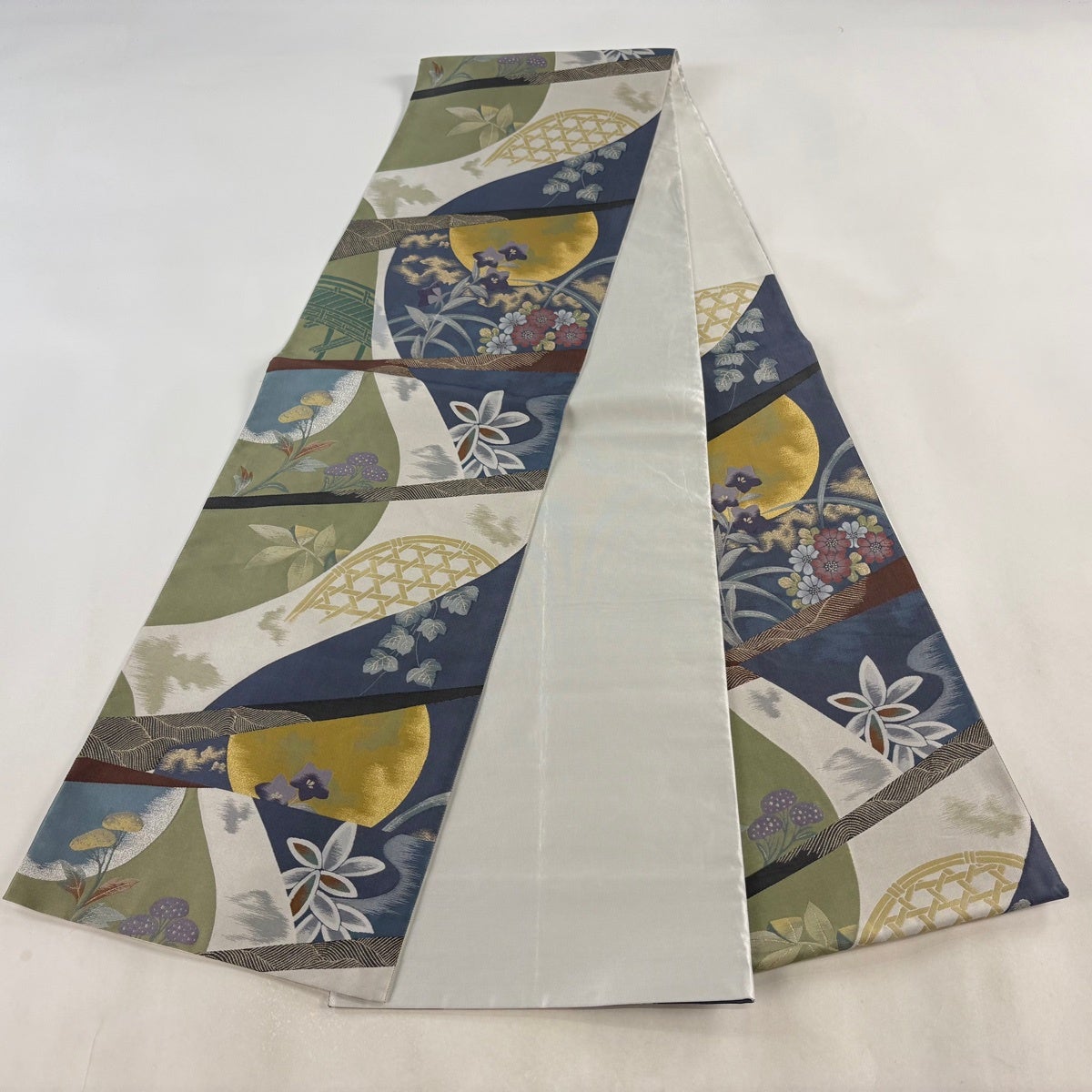 袋帯 秀品 秋花彩光 風月山河 月 秋草 金糸 箔 青灰色 お太鼓柄 正絹