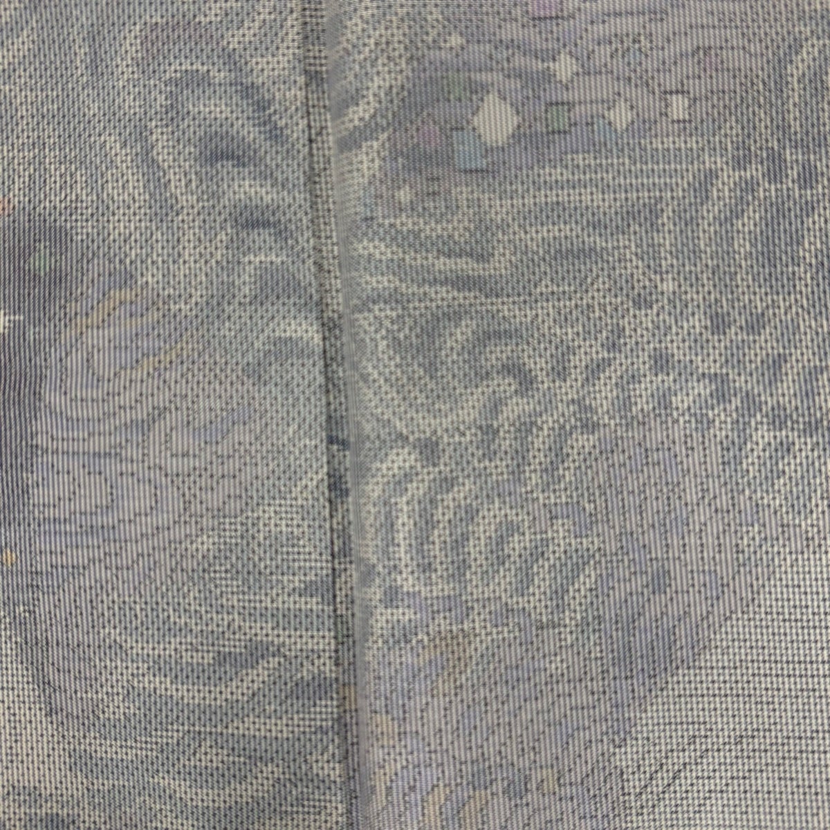 【美品】 袋帯 名品 草花 幾何学模様 銀糸 金彩 青灰色 六通 正絹