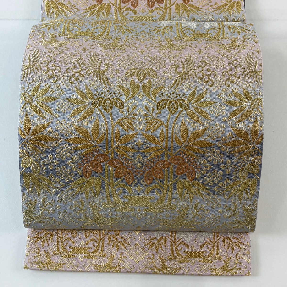 【美品】 開き名古屋帯 逸品 龍村美術織物 比翼仕立て 華文 鳥 青灰色 正絹