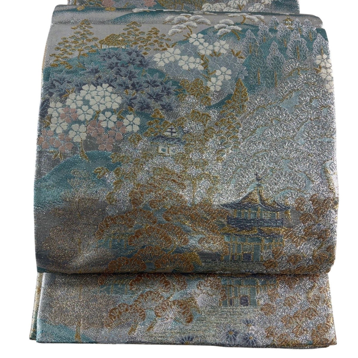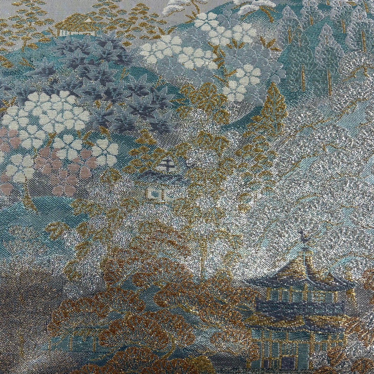 【美品】 袋帯 秀品 落款あり 山 霞 箔 青緑 お太鼓柄 正絹