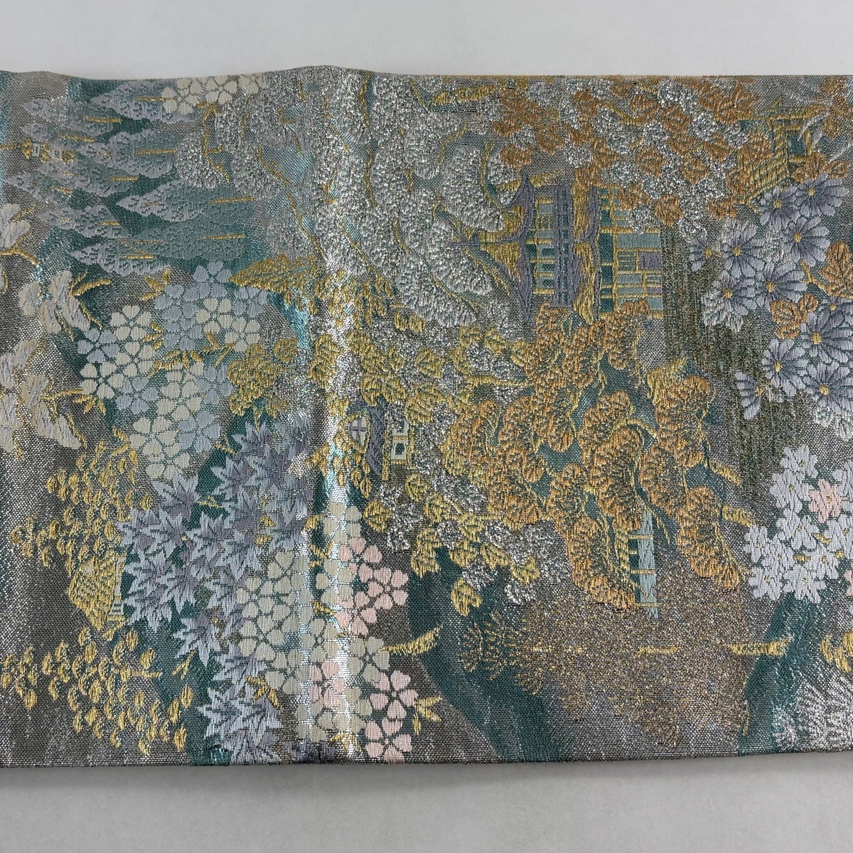 袋帯 秀品 関西仕立て 宝飾正倉華文 金糸 箔 青緑 六通 正絹
