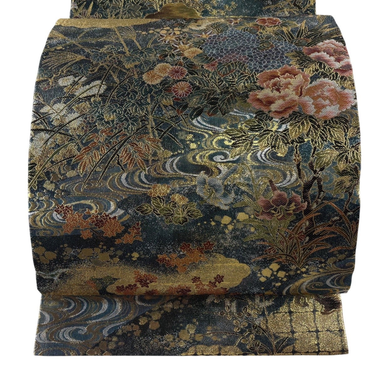 袋帯 逸品 紋屋井関 落款あり 段縞 花鳥 金銀糸 御寮織 青緑 六通 正絹