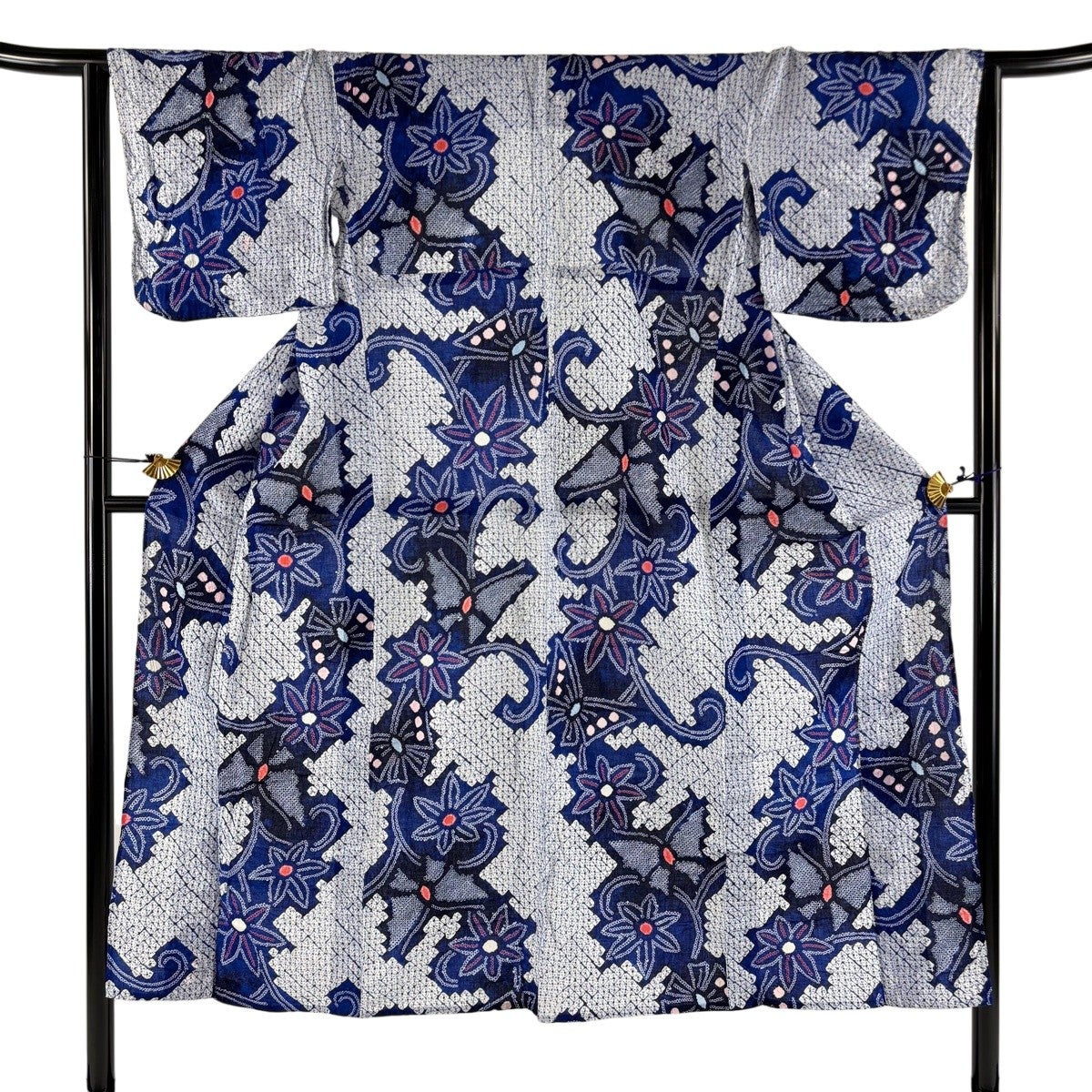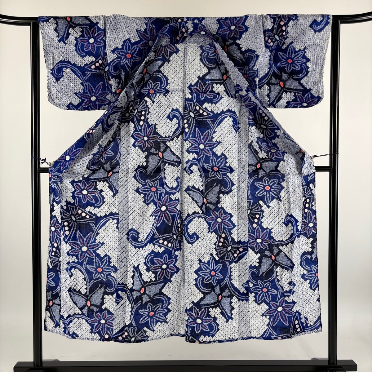 浴衣 身丈163.5cm 裄丈65cm M 絞り浴衣 草花 幾何学模様 青 綿 名品