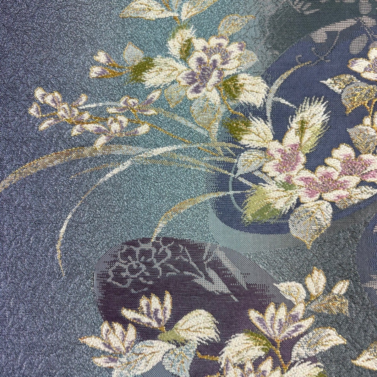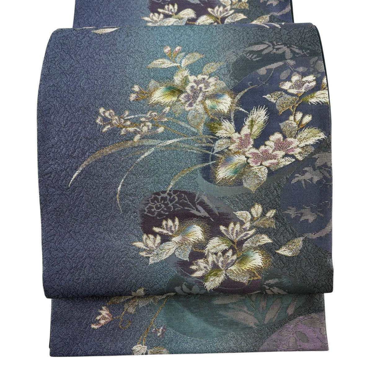 【美品】 袋帯 秀品 草花 銀糸 ぼかし 青紫 お太鼓柄 正絹