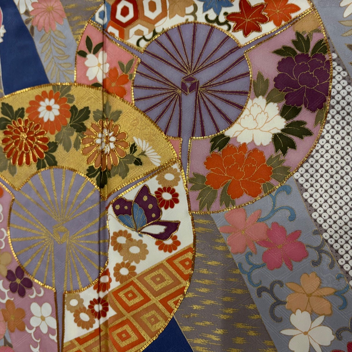 振袖 身丈160cm 裄丈62cm S 袷 吾妻徳穂 落款あり 扇 草花 金糸 金彩 青紫 正絹 名品