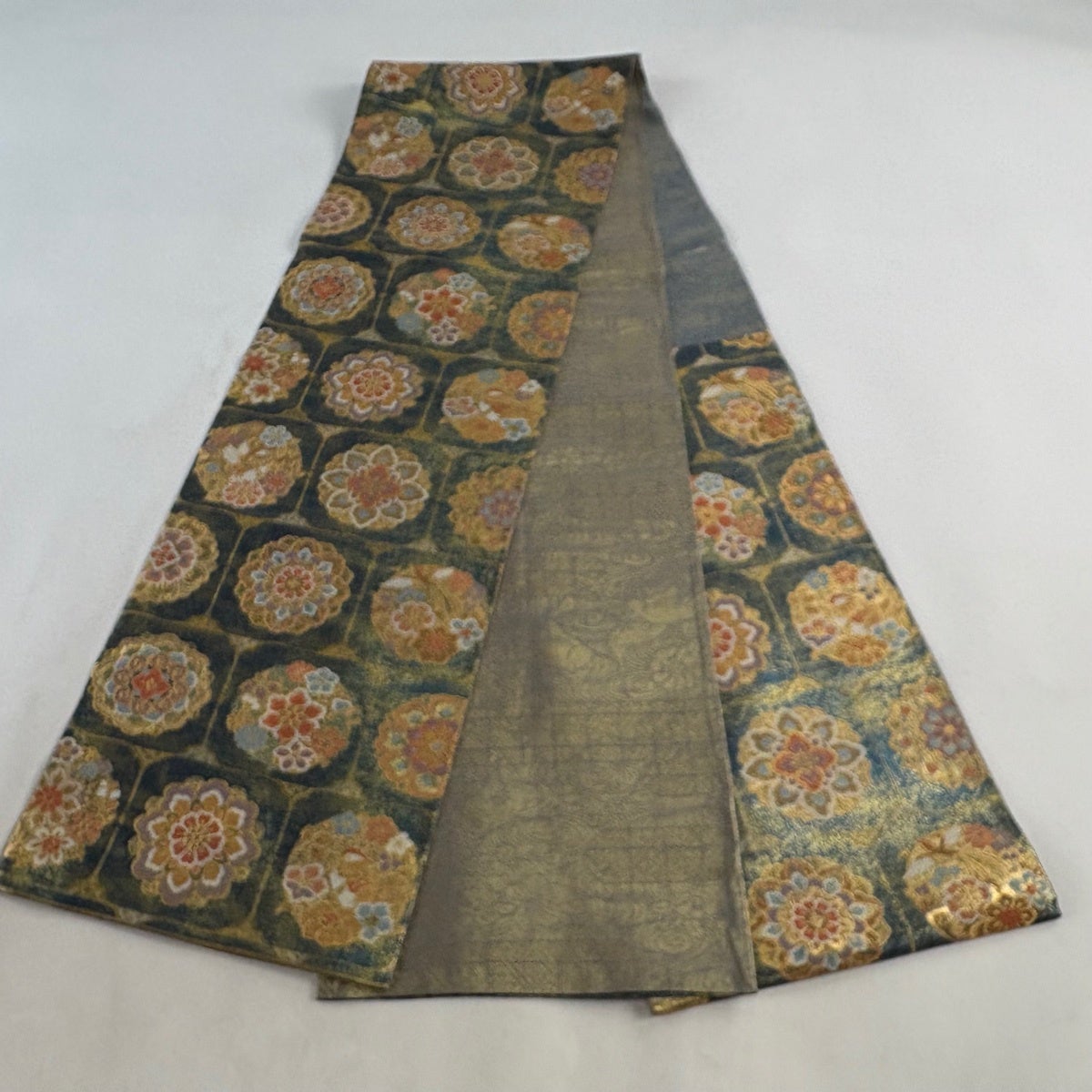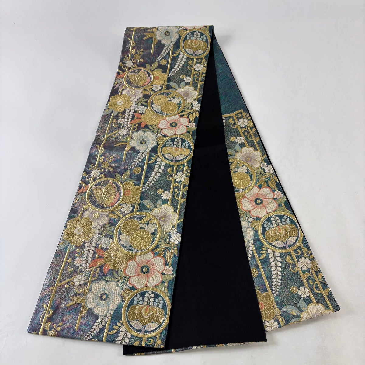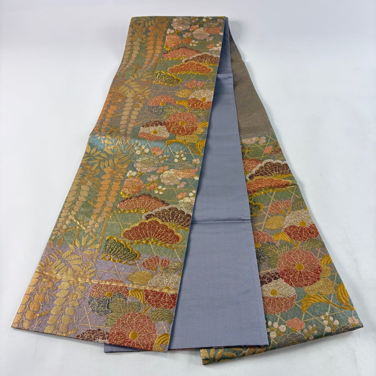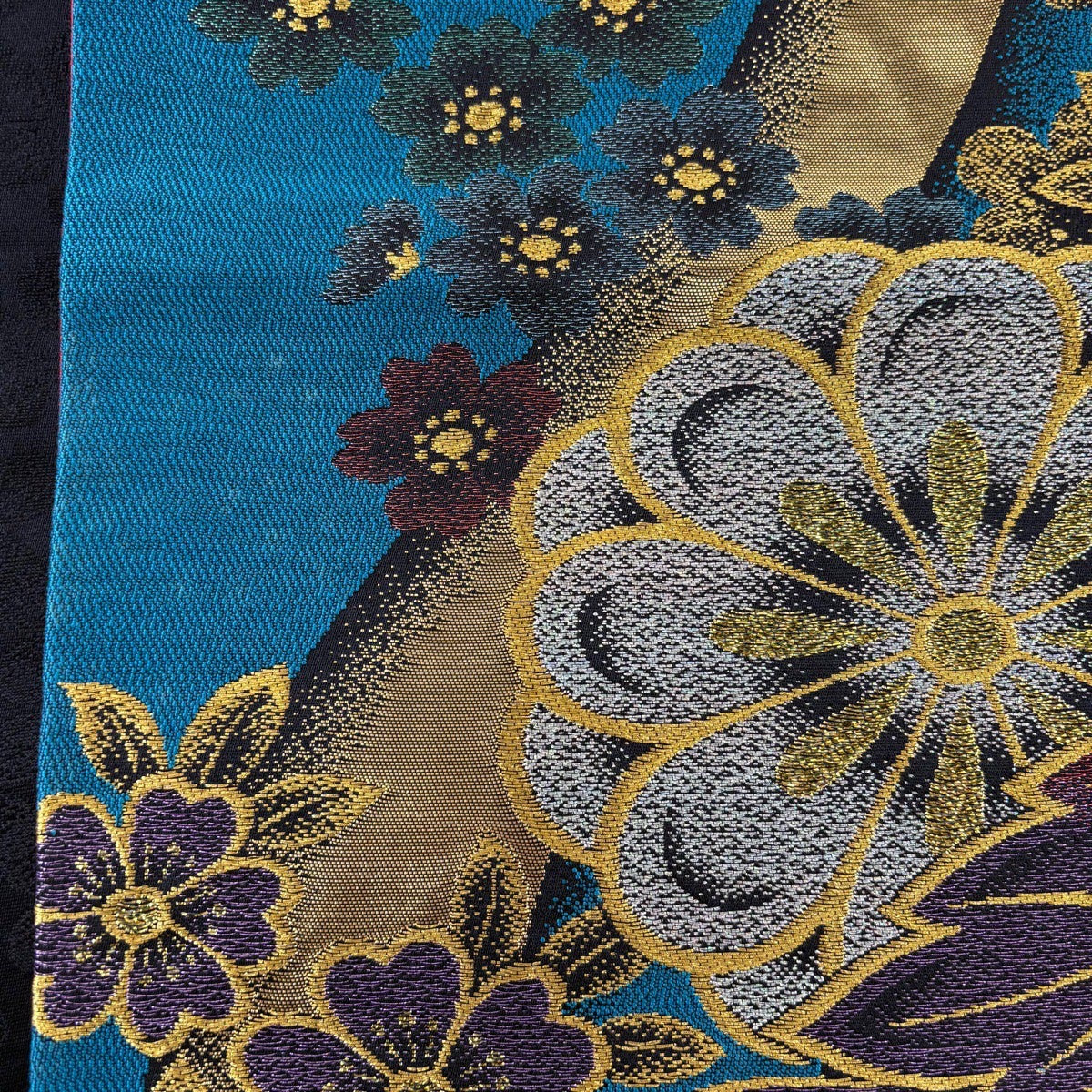 50%OFF 袋帯 秀品 菊 熨斗 刺繍 金糸 青緑 六通 正絹 K50