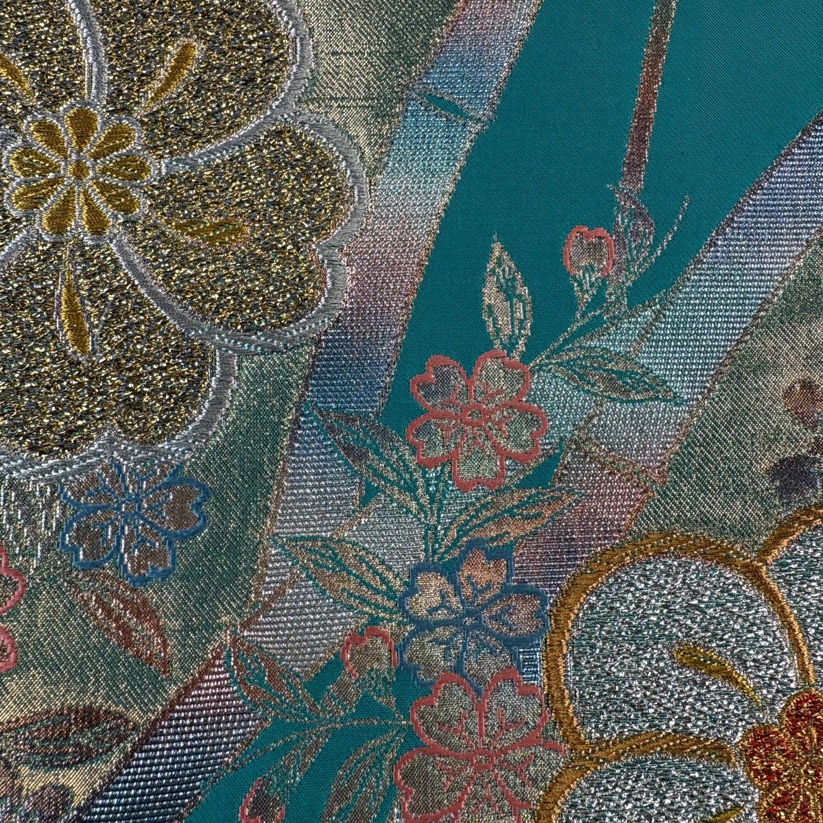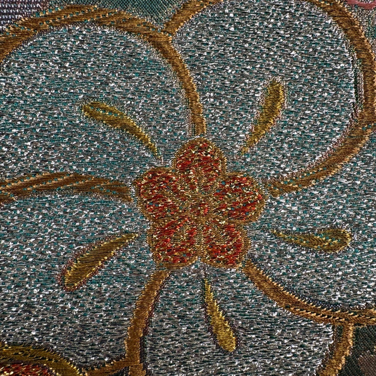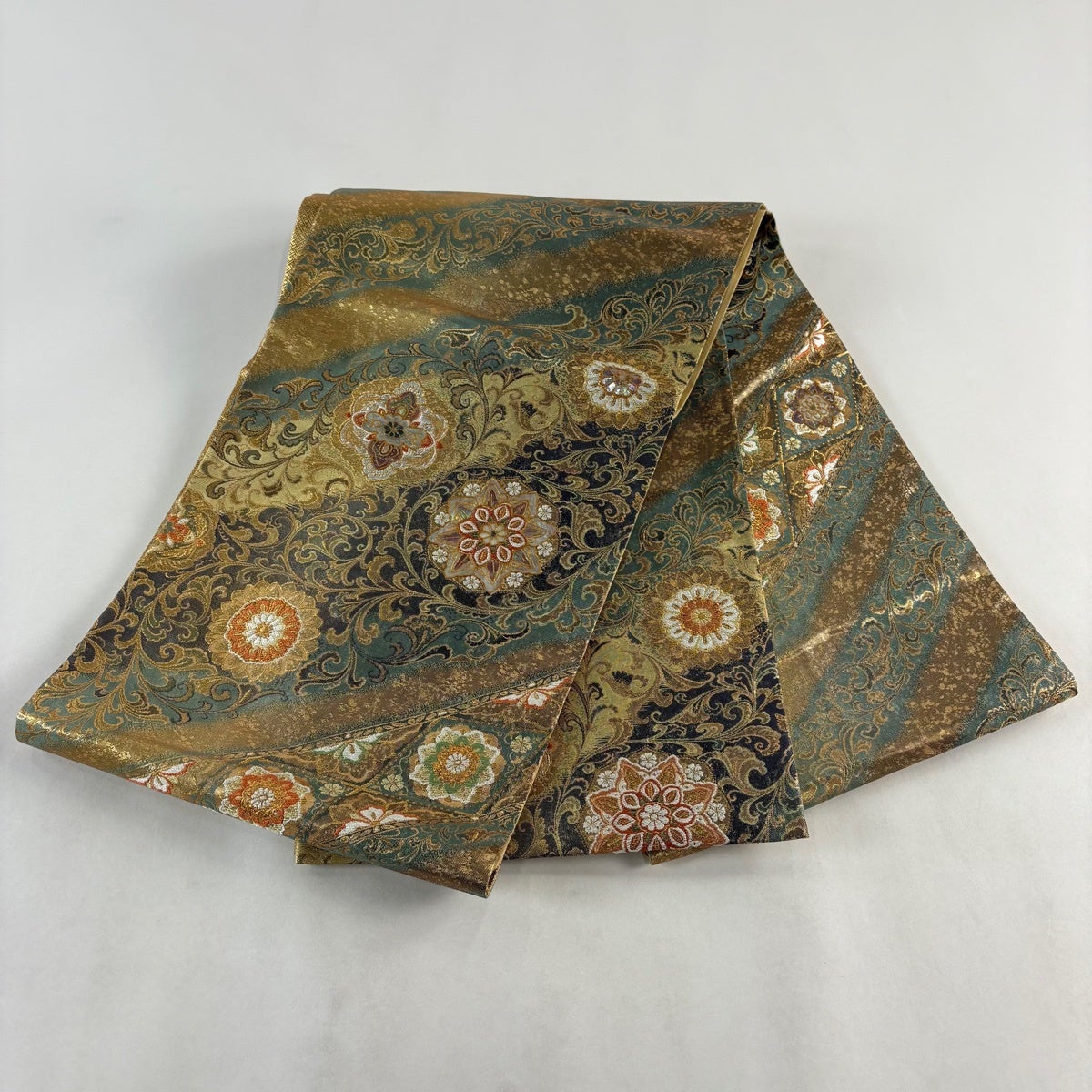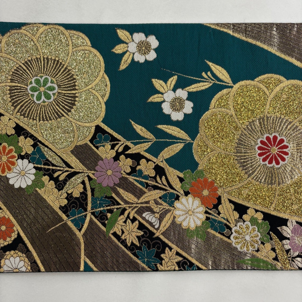 50%OFF 袋帯 秀品 菊 熨斗 刺繍 金糸 青緑 六通 正絹 K50