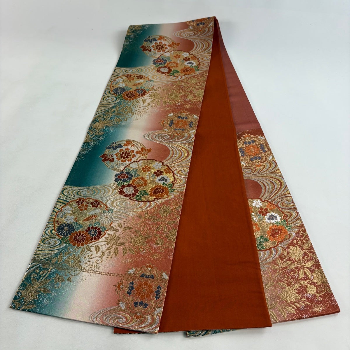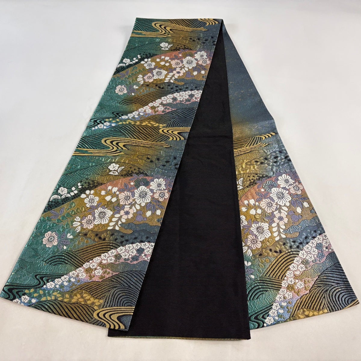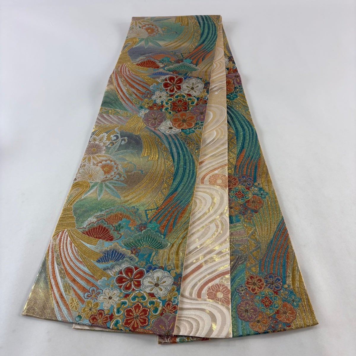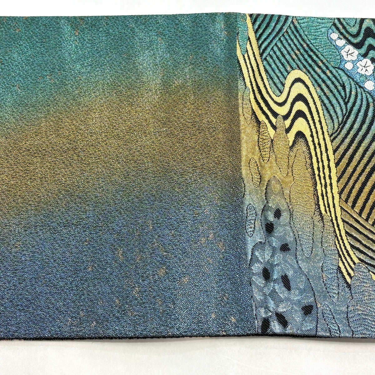 50%OFF 袋帯 名品 全通両面織 波 箔 青緑 全通 正絹 K50