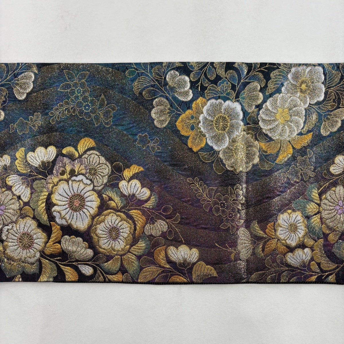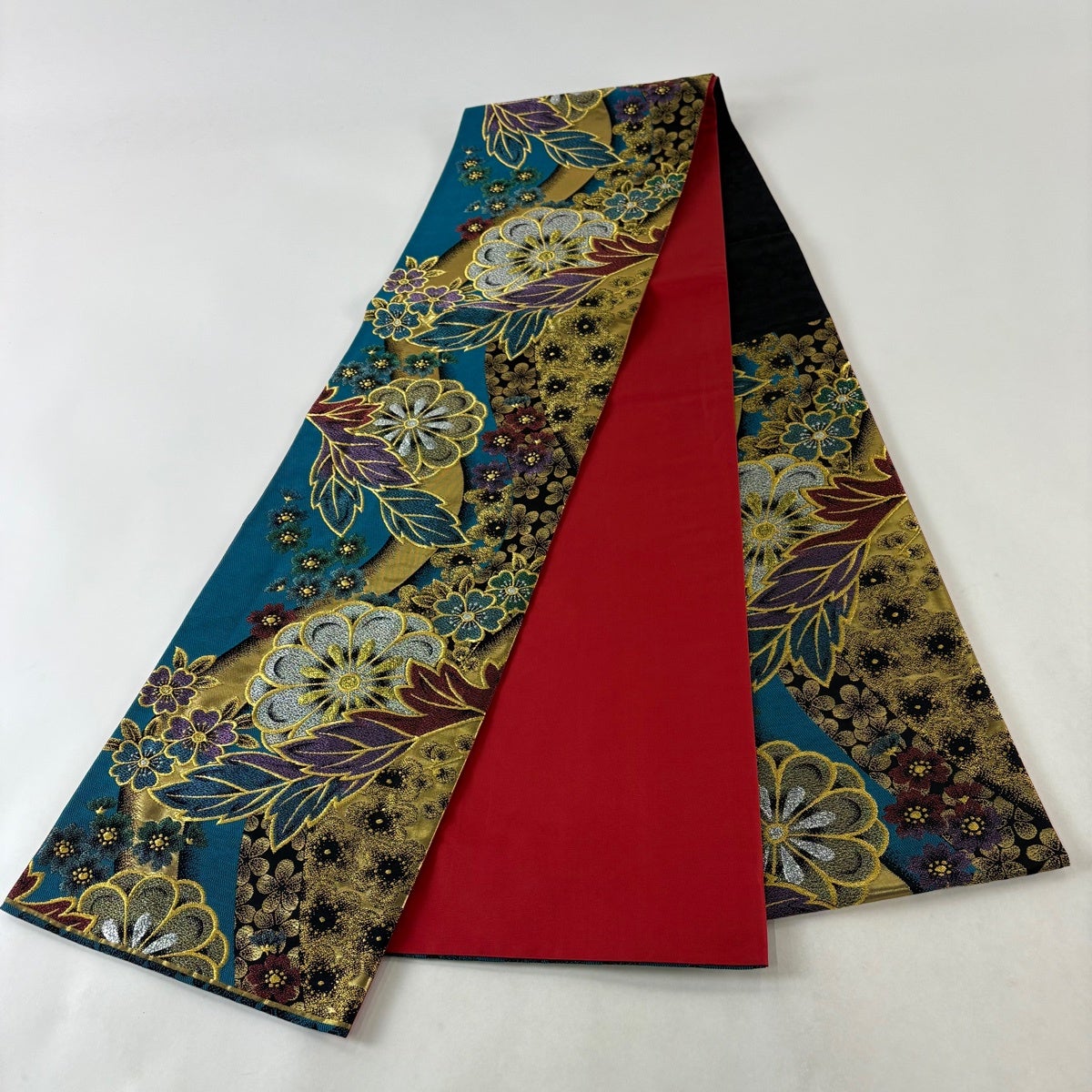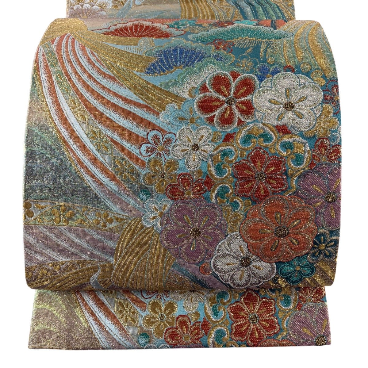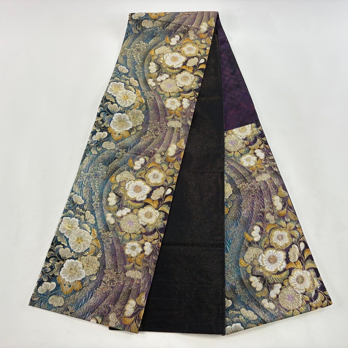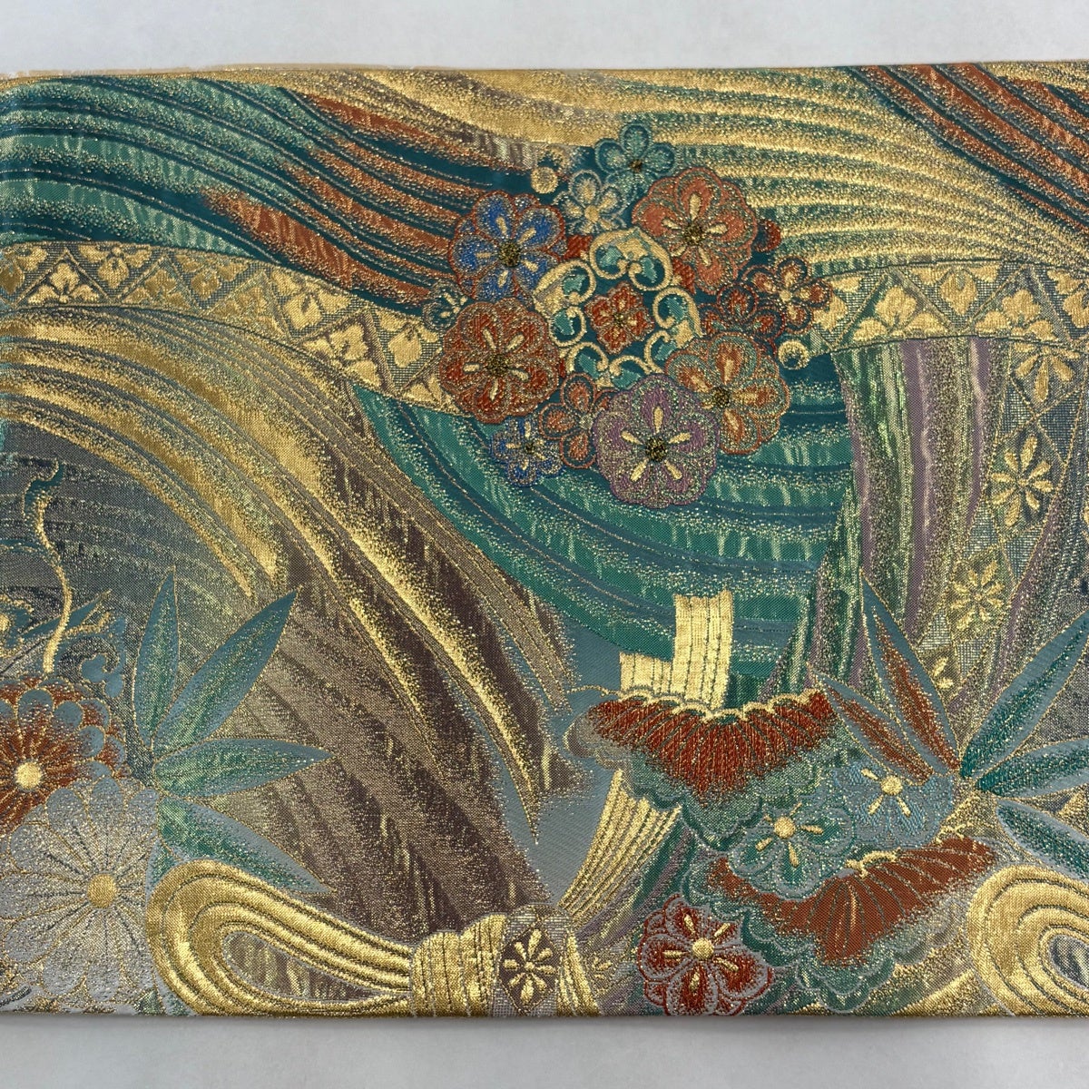 50%OFF 袋帯 名品 全通両面織 波 箔 青緑 全通 正絹 K50