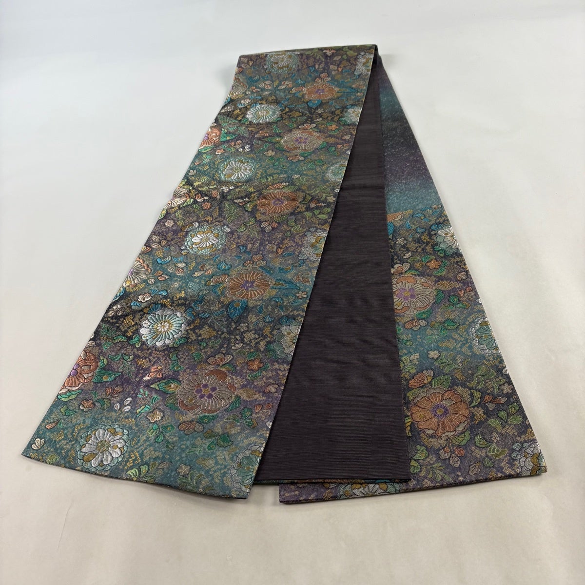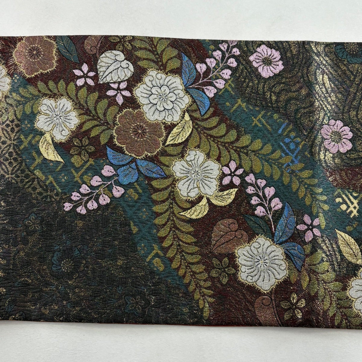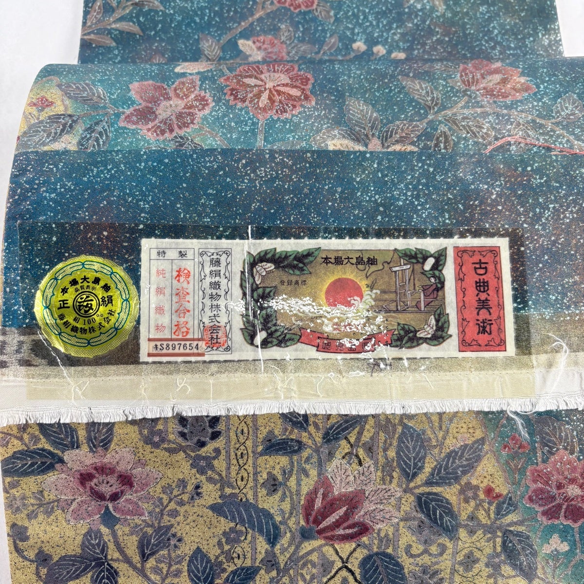 【美品】 袋帯 秀品 証紙あり 大島紬地 草花 金彩 青緑 全通 正絹