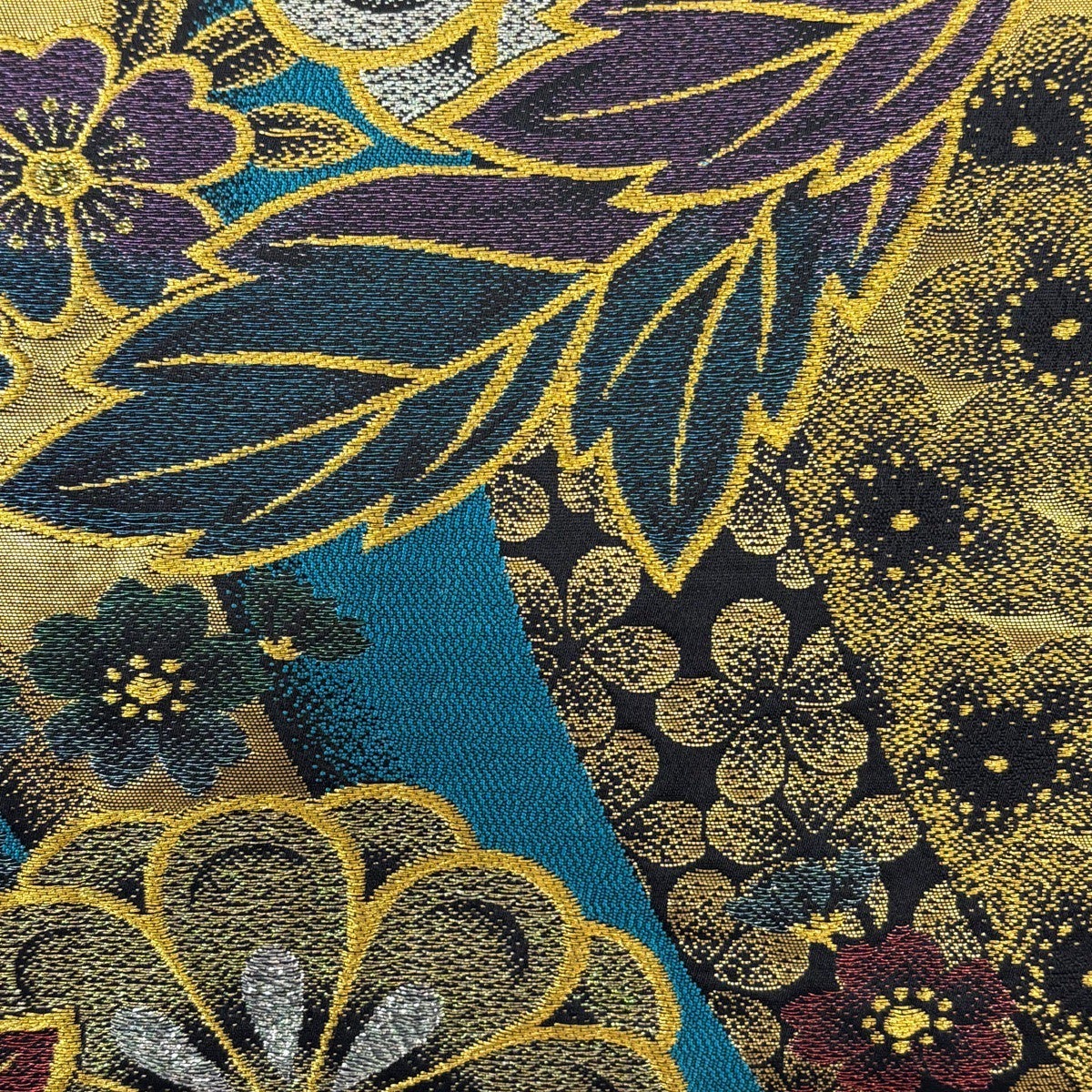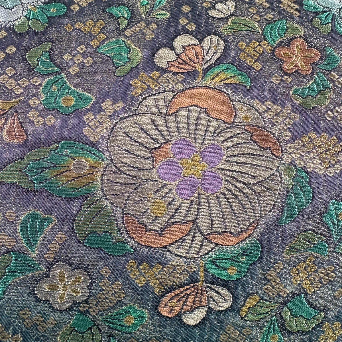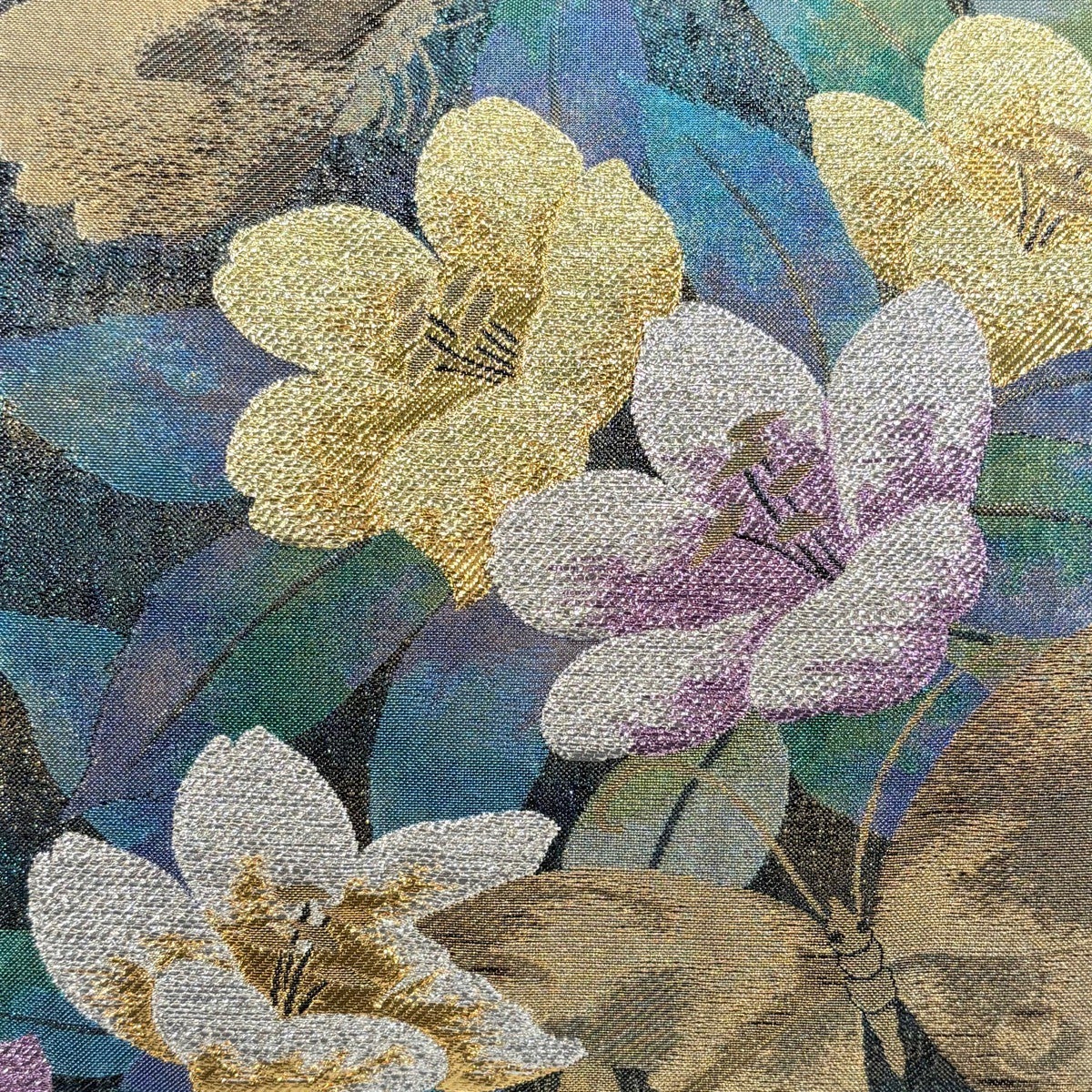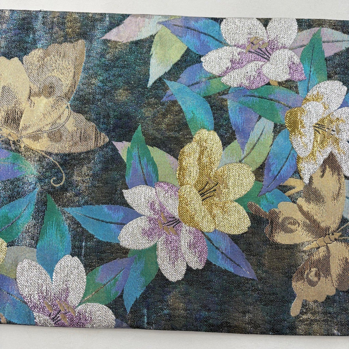 【美品】 袋帯 秀品 証紙あり 大島紬地 草花 金彩 青緑 全通 正絹