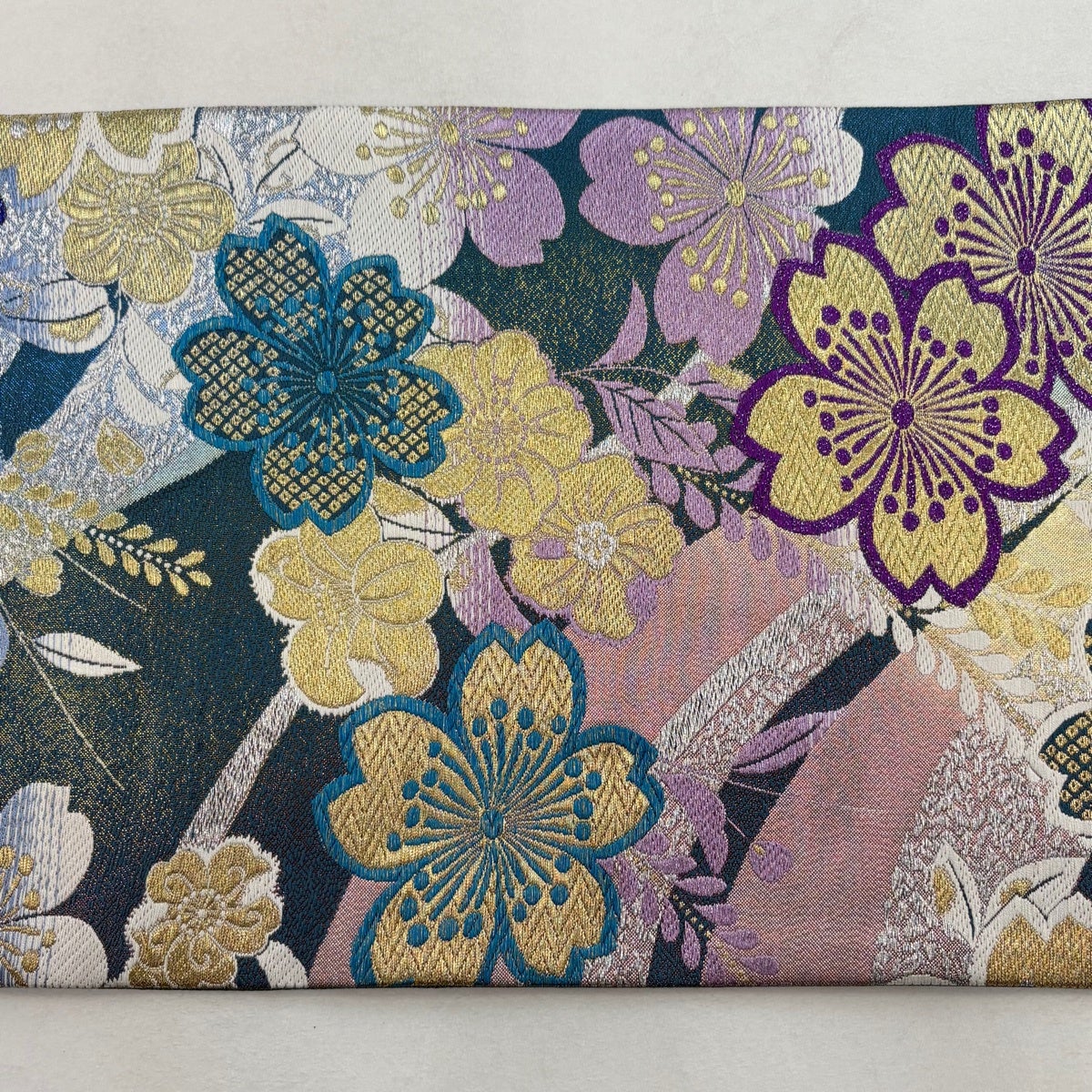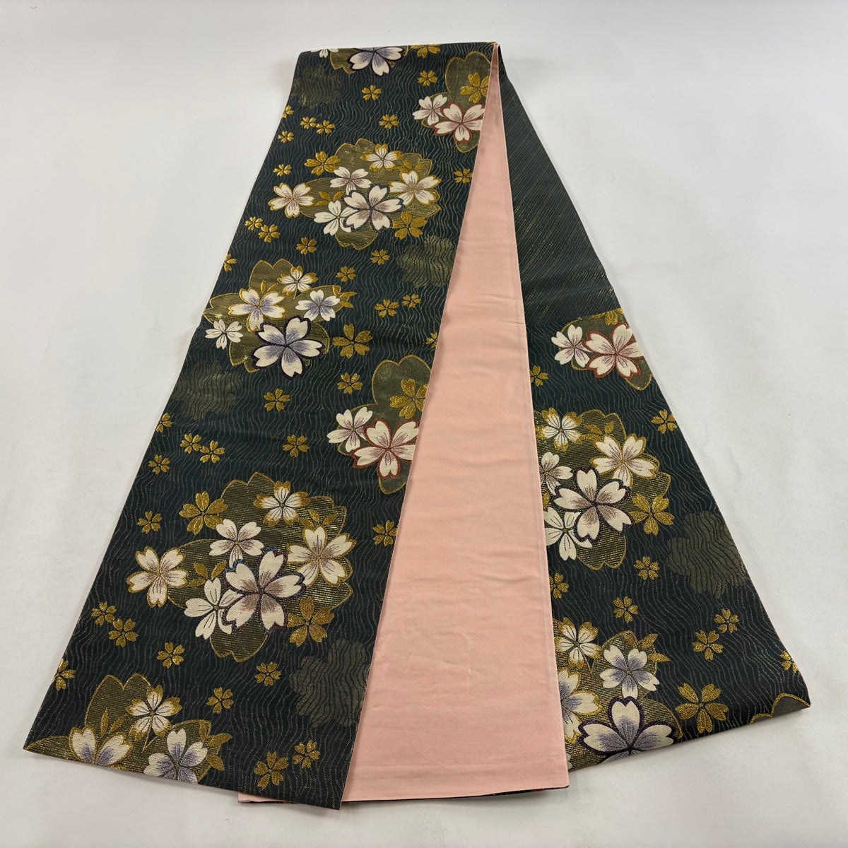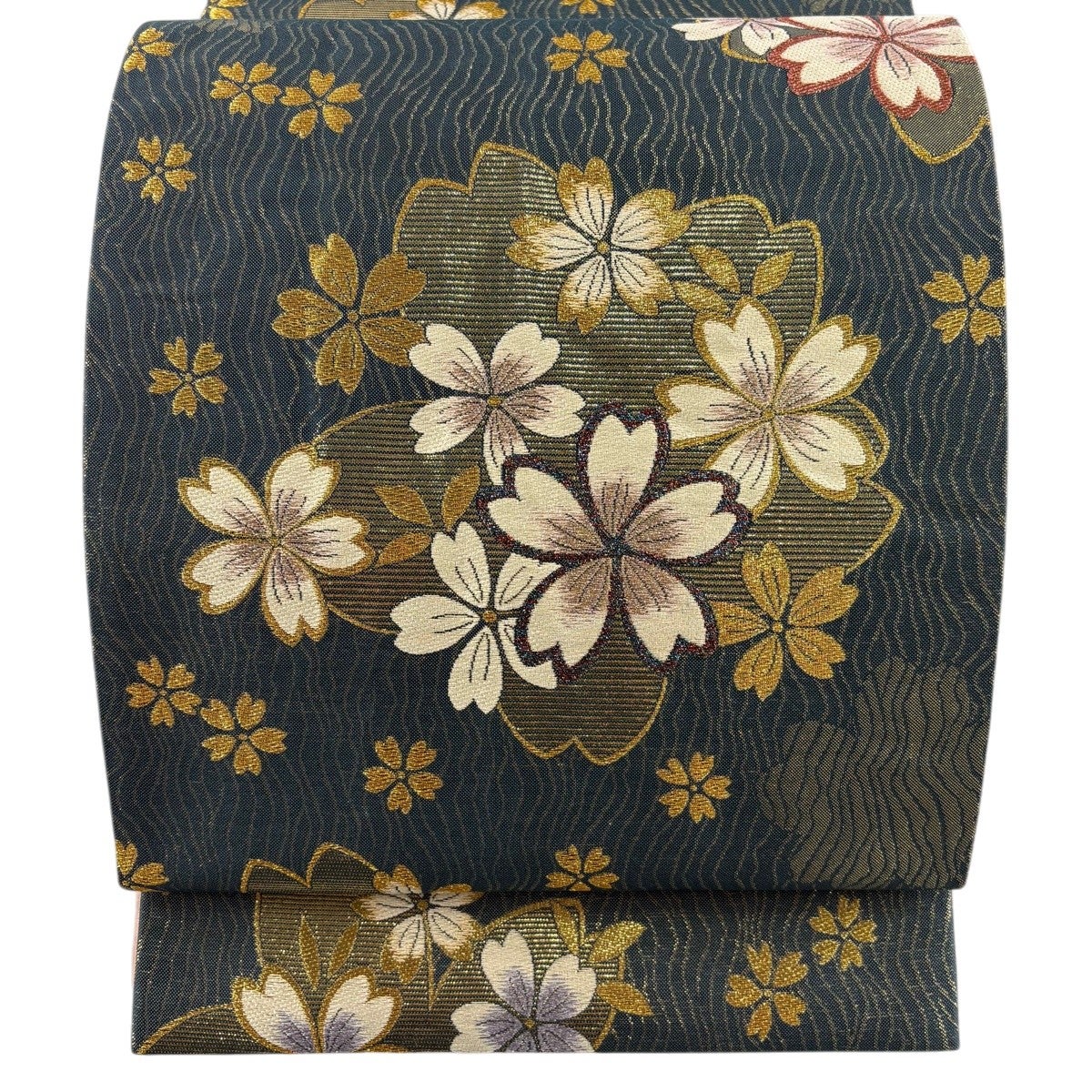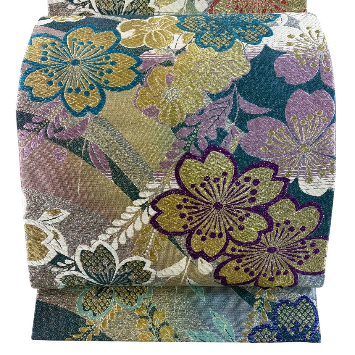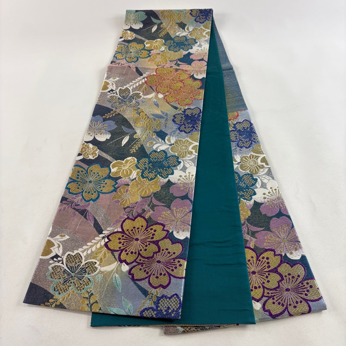 【美品】 袋帯 秀品 振袖向き 鎌倉紋 桜 箔 金糸 青緑 六通 正絹