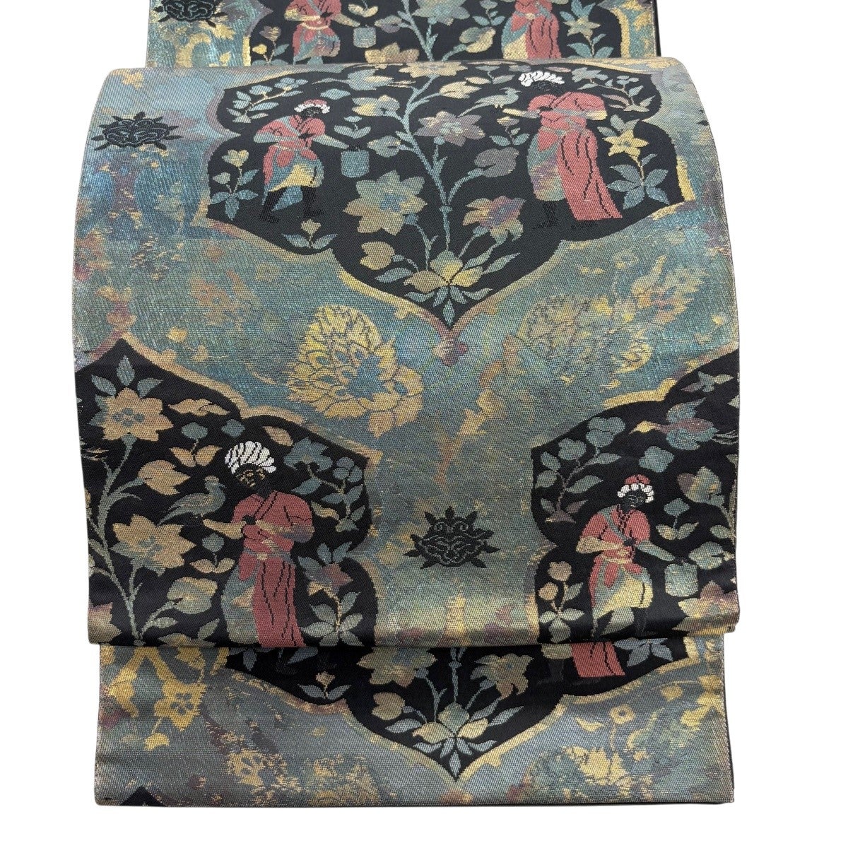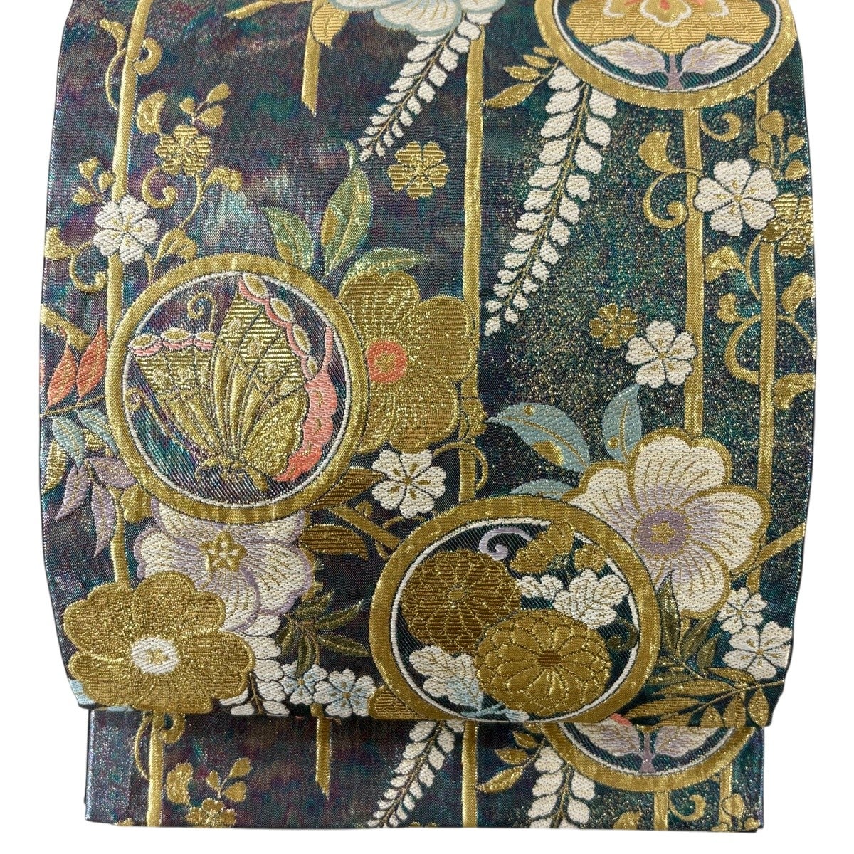 50%OFF 袋帯 秀品 花鳥 華文 金糸 箔 青緑 六通 正絹 K50