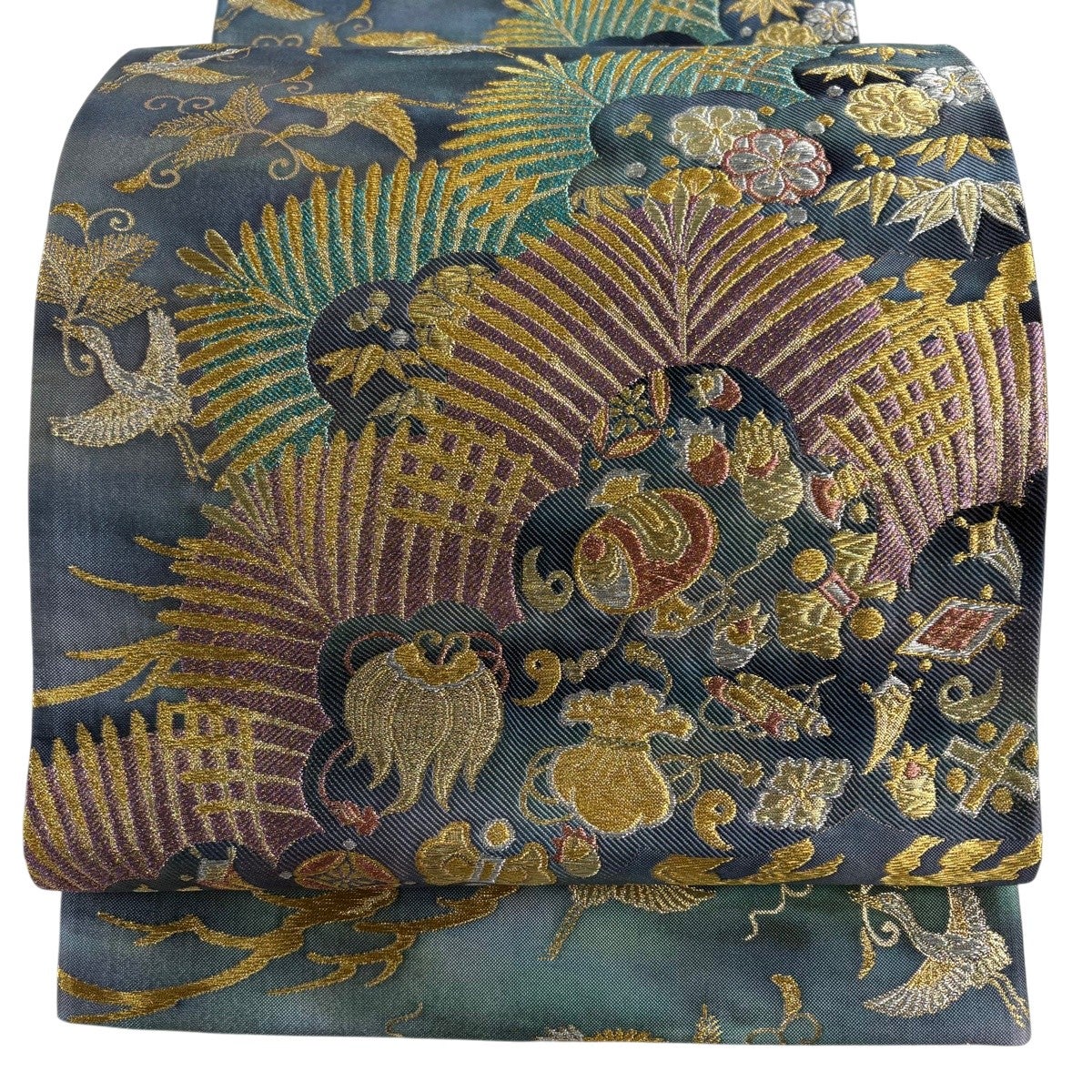 【美品】 袋帯 秀品 宝尽くし 松竹梅 金銀糸 箔 青緑 六通 正絹