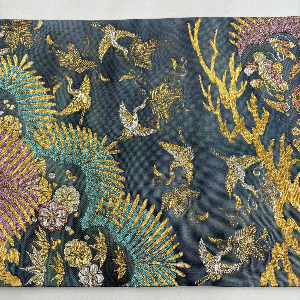 50%OFF 袋帯 秀品 鶴 松竹梅 箔 唐織 青緑 六通 正絹 K50