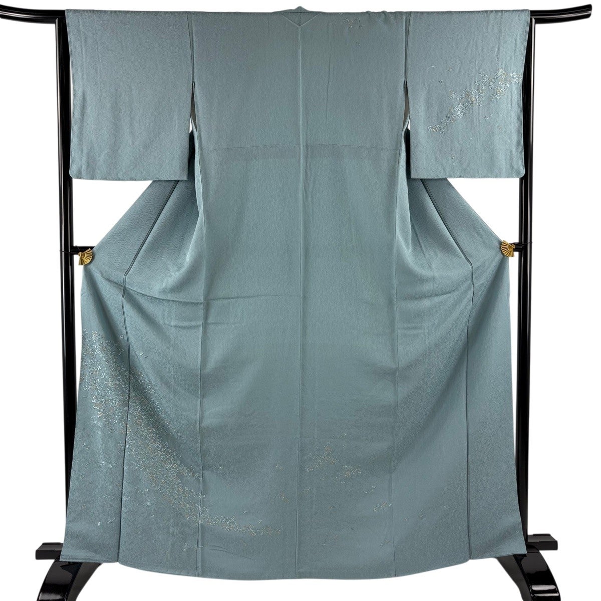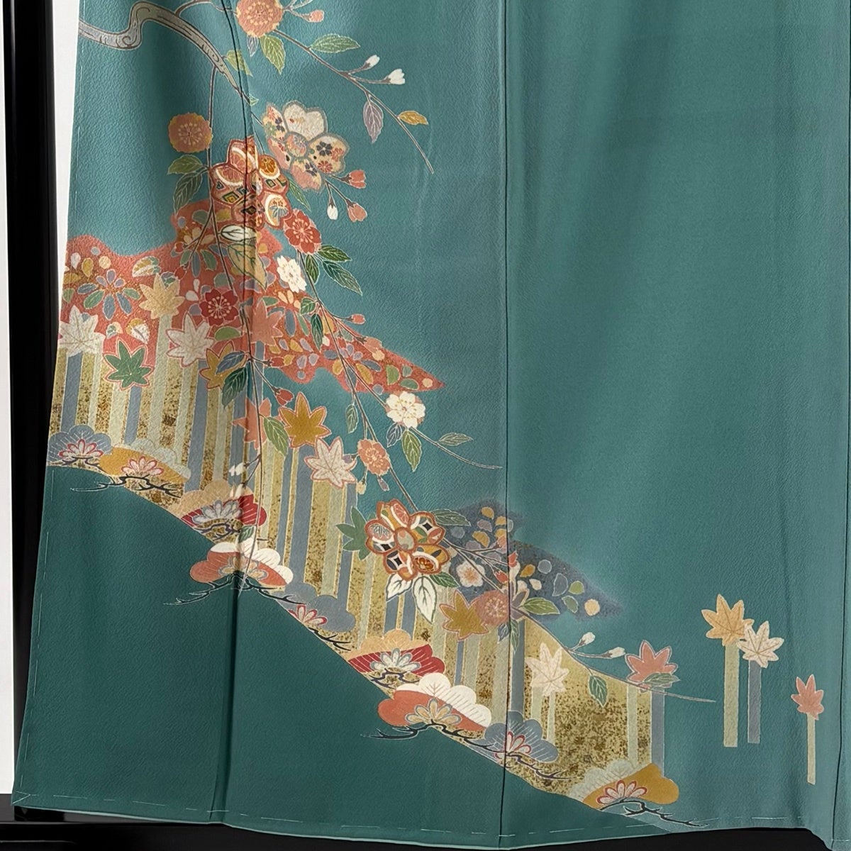 50%OFF 訪問着 身丈165cm 裄丈65cm M 袷 草花 箔散らし 銀糸 金彩 青緑 正絹 秀品 K50