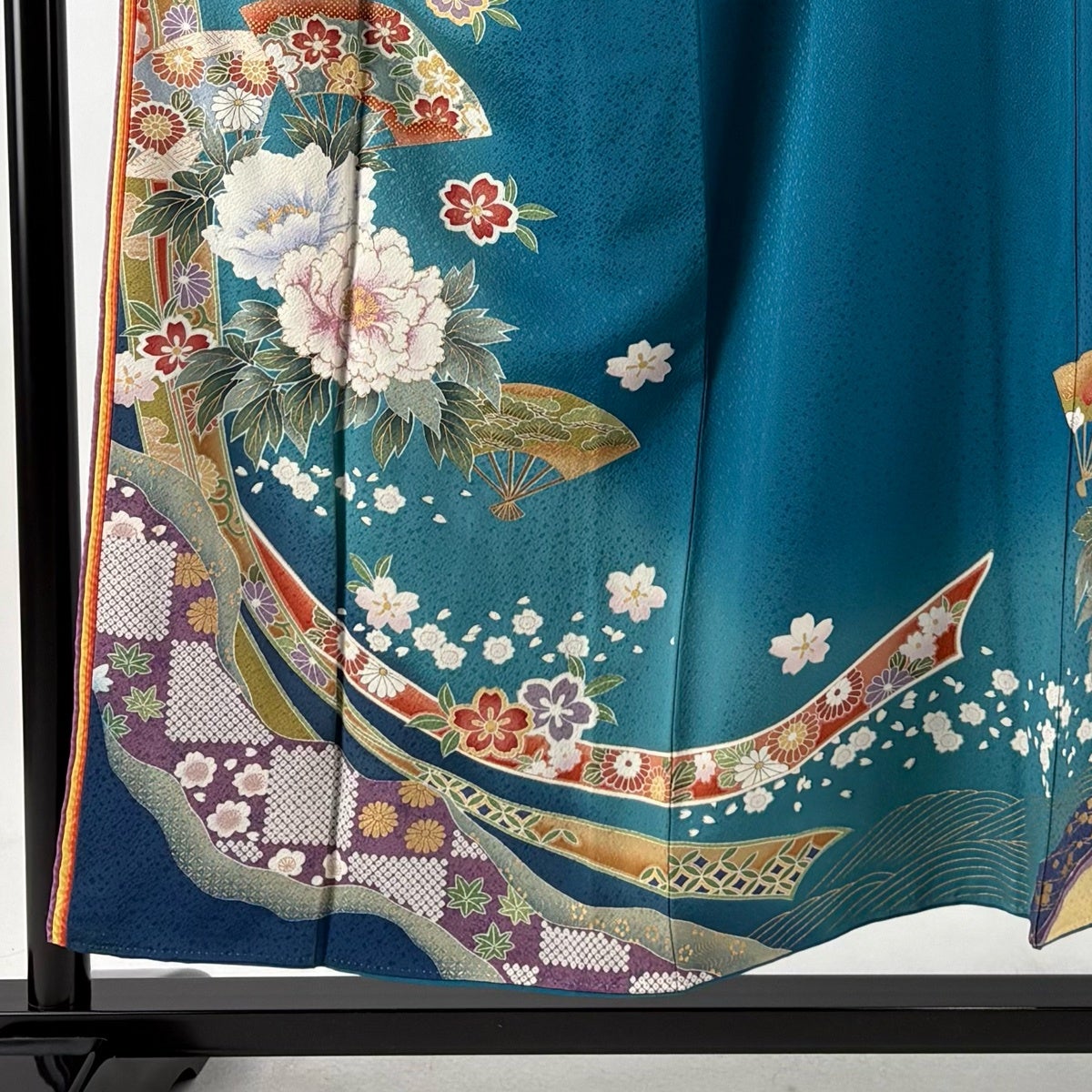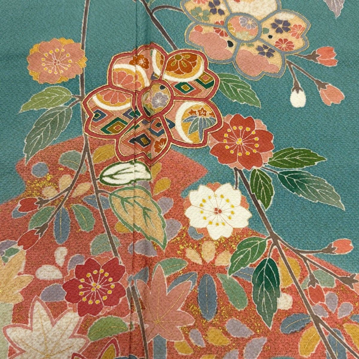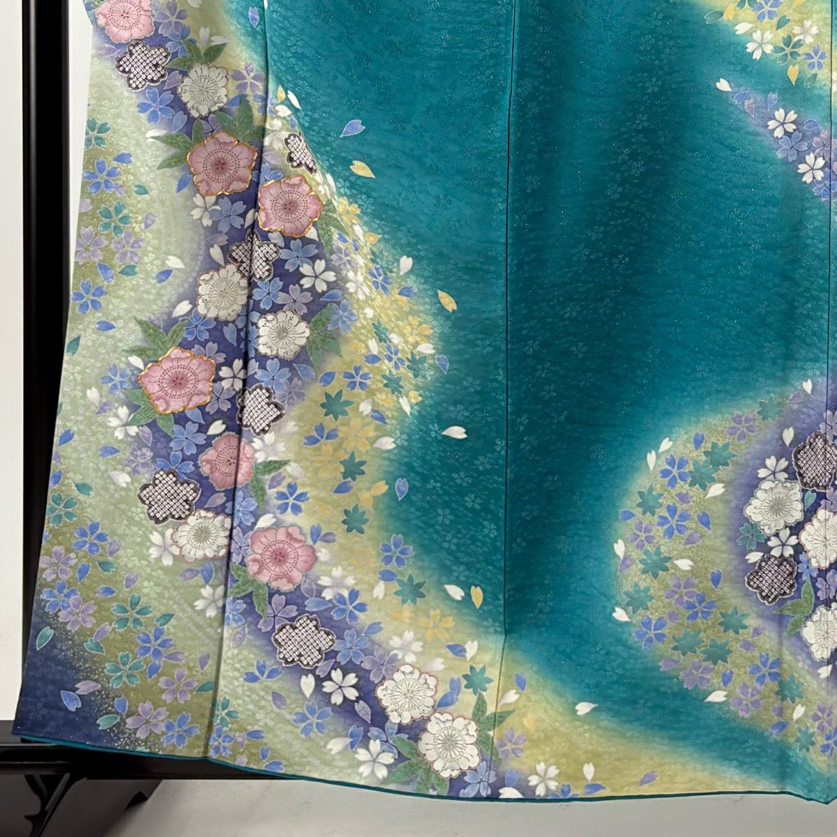 20%OFF 振袖 身丈164cm 裄丈66.5cm M 袷 牡丹 桜 銀通し 箔 青緑 正絹 逸品 K30