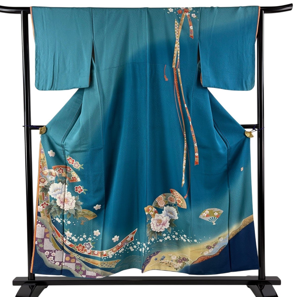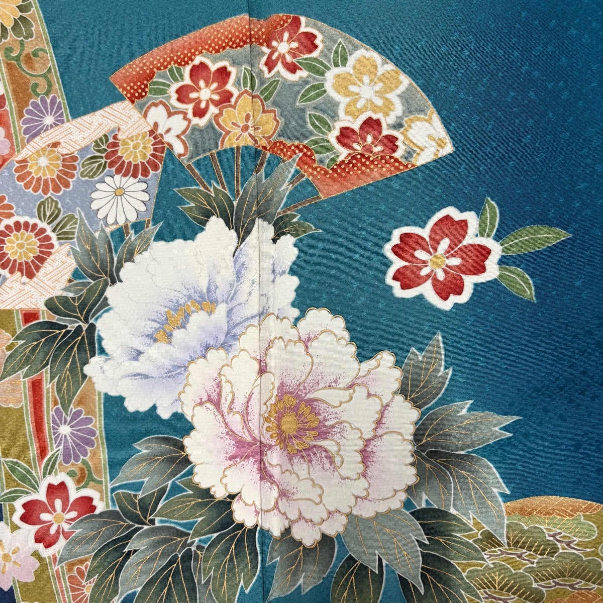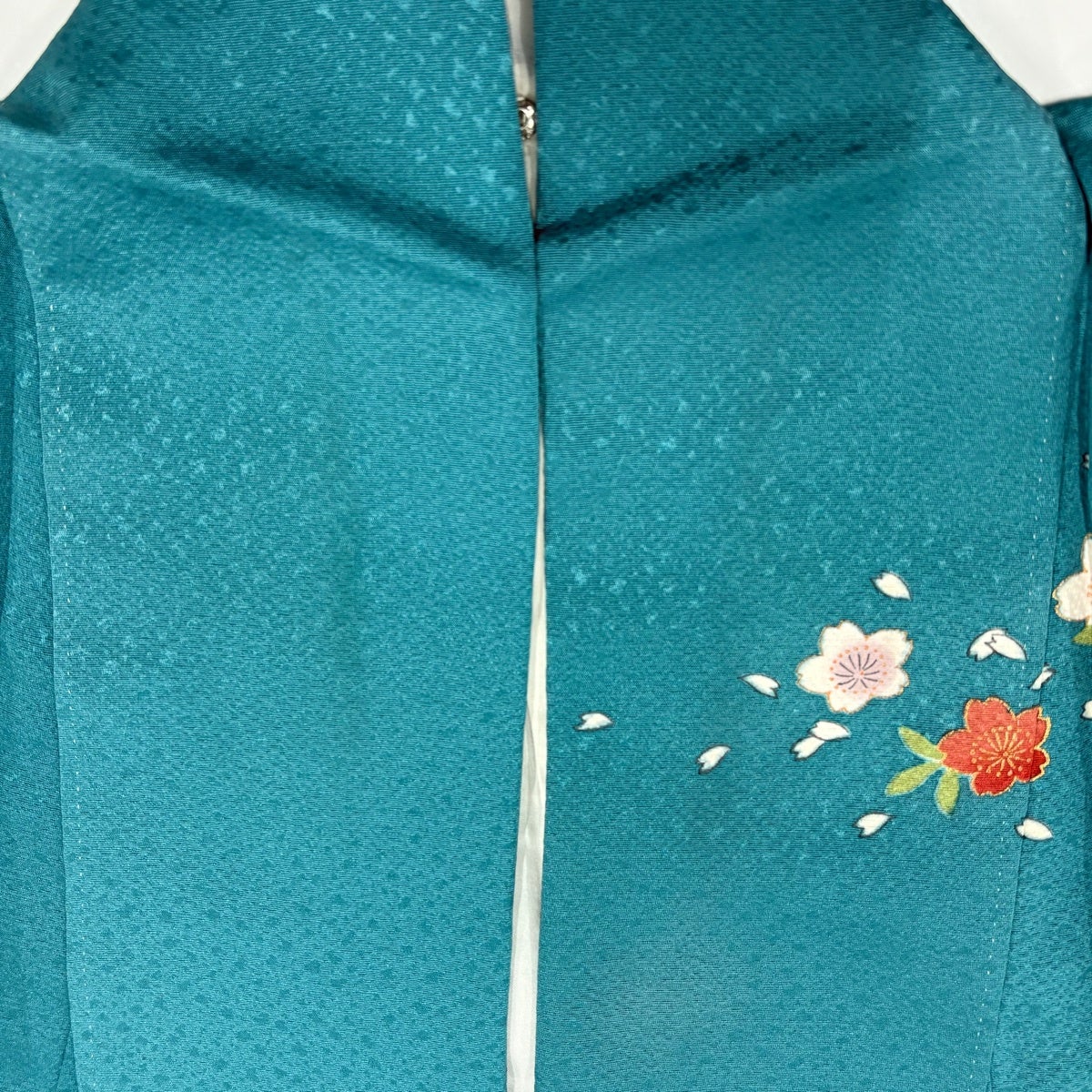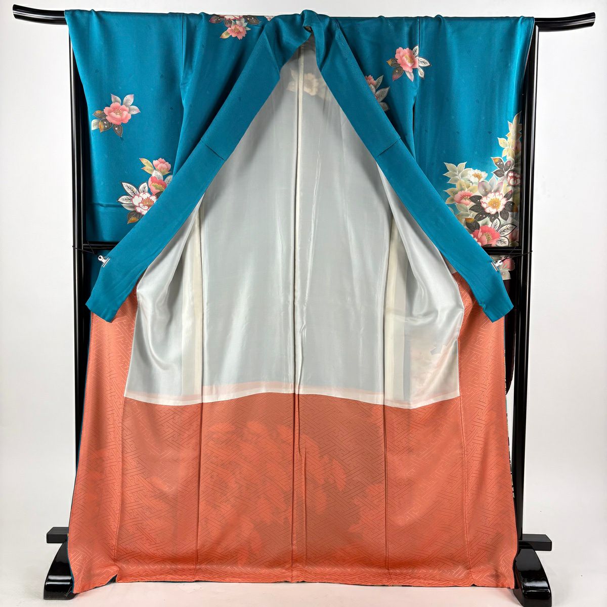 20%OFF 振袖 身丈164cm 裄丈66.5cm M 袷 牡丹 桜 銀通し 箔 青緑 正絹 逸品 K30