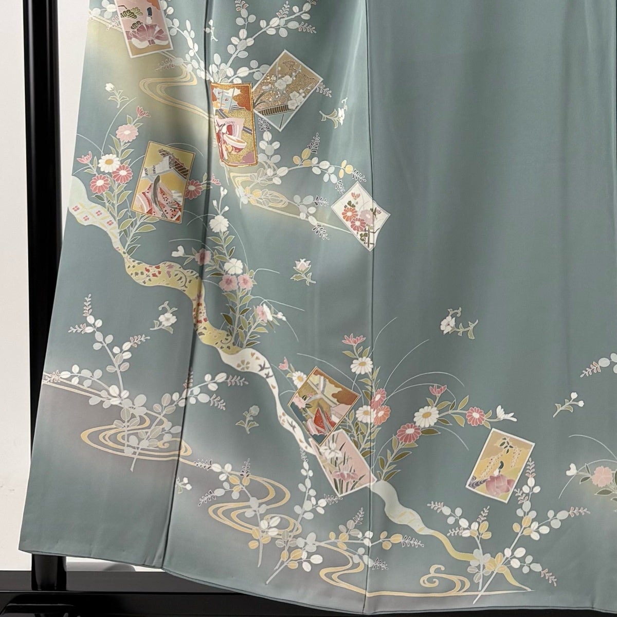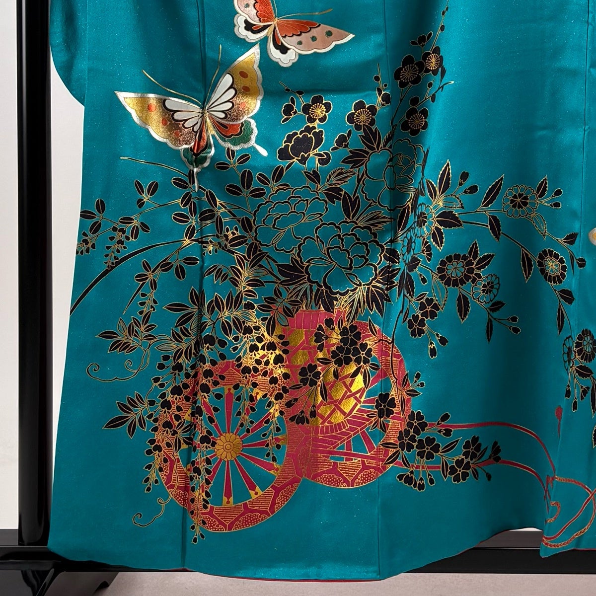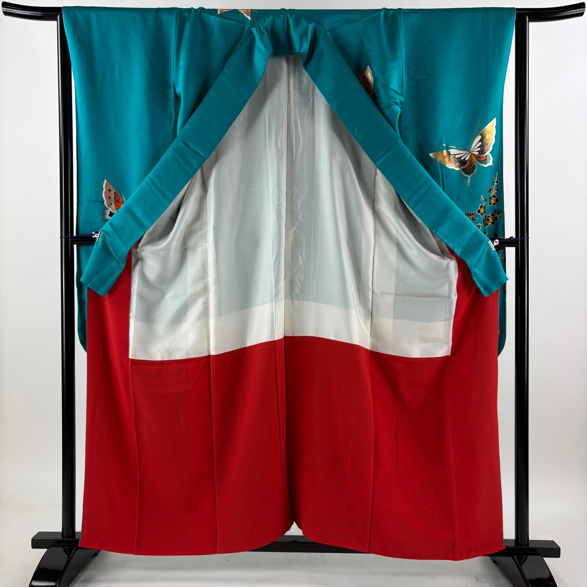 40%OFF 振袖 身丈168.5cm 裄丈70cm L 袷 蝶 草花 銀通し 箔 青緑 正絹 逸品 K30