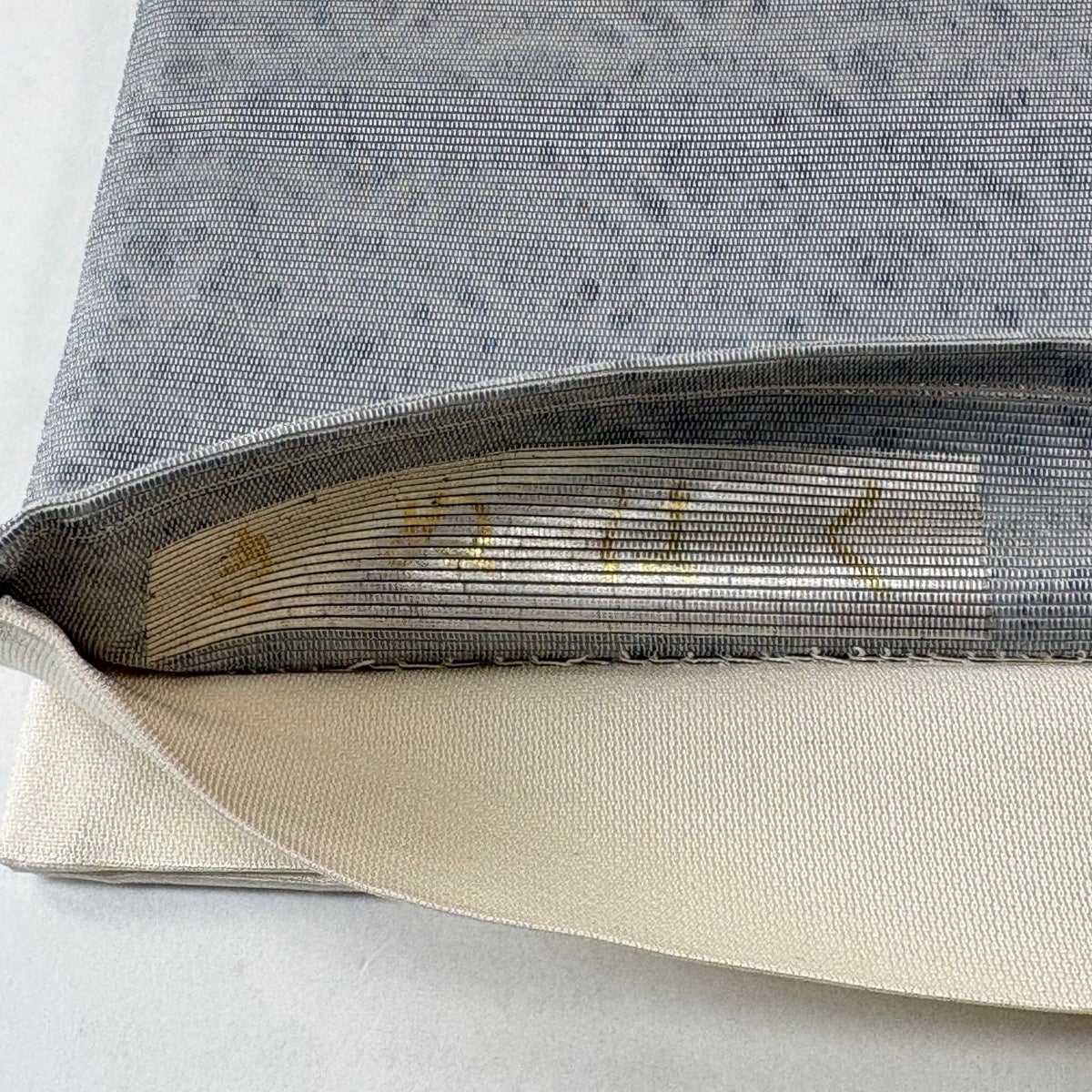 【美品】 名古屋帯 秀品 八寸名古屋帯 松葉仕立て 斜め格子 金糸 青灰色 正絹