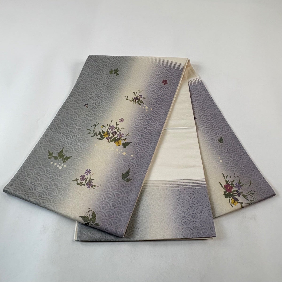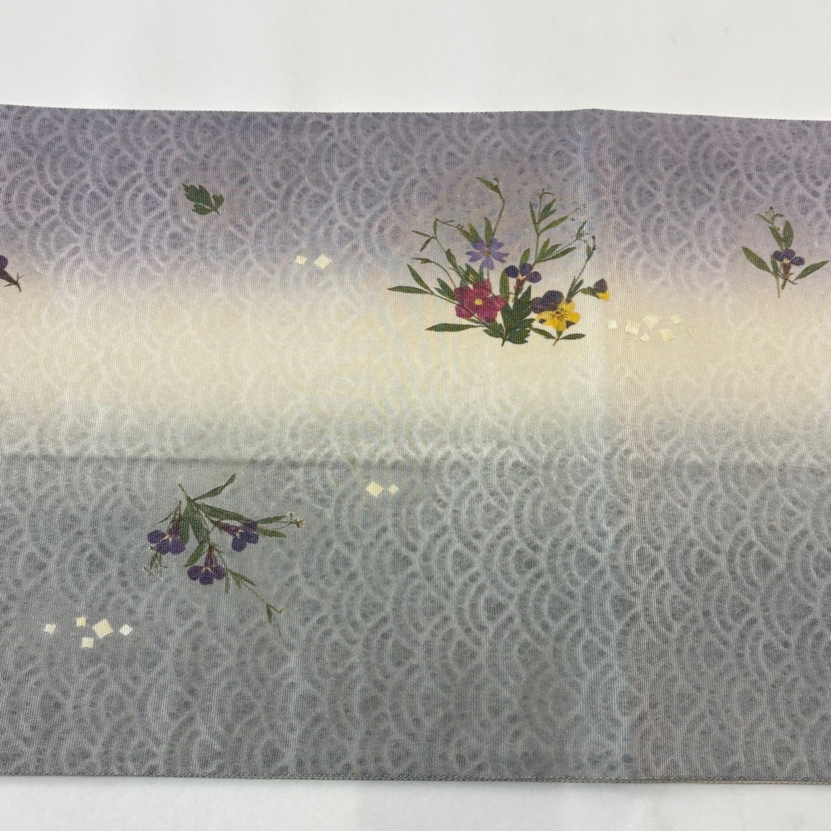 袋帯 秀品 落款あり きぬはく 白井功 草花 青海波 灰紫 お太鼓柄 正絹