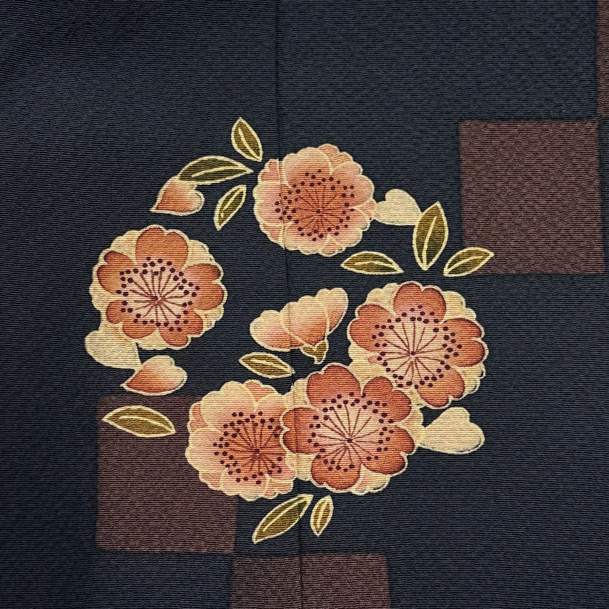 紬 身丈162cm 裄丈64cm M 袷 ますいわ屋 草花 紺色 正絹 秀品