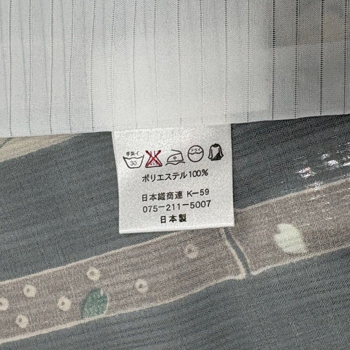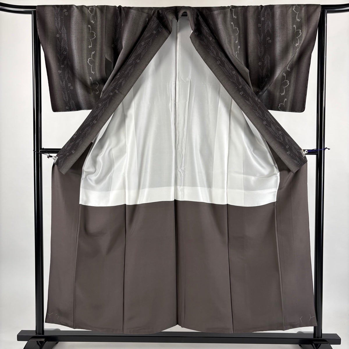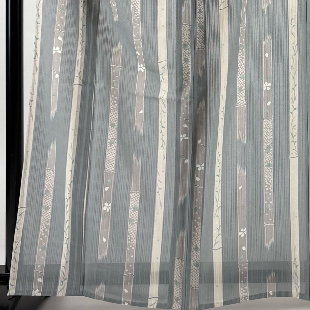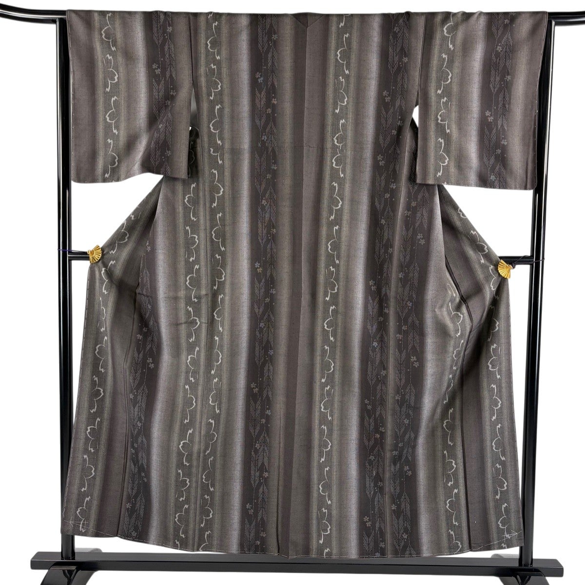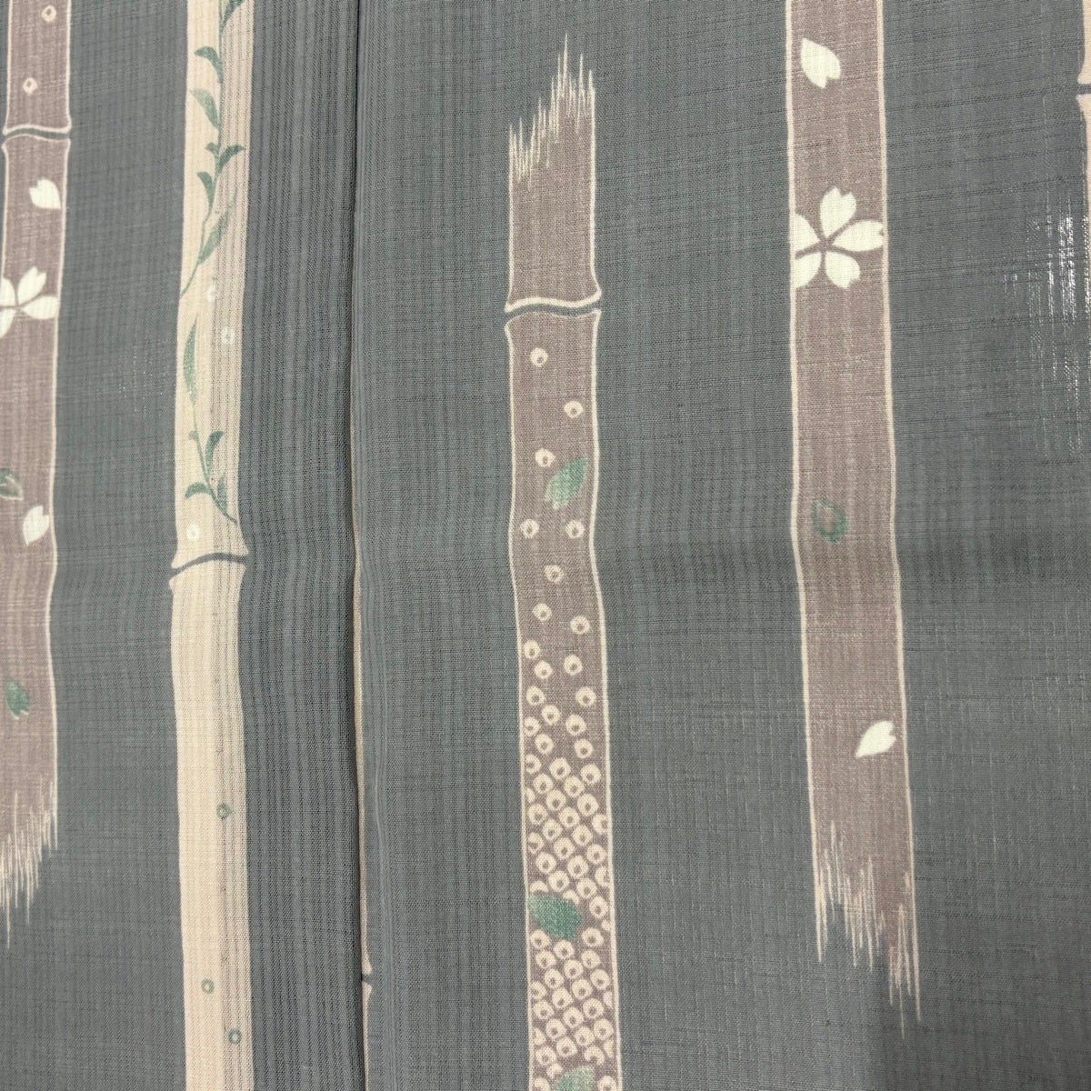【美品】 小紋 身丈164cm 裄丈65.5cm M 薄物 洗える着物 竹縞 桜 灰緑 化繊 秀品