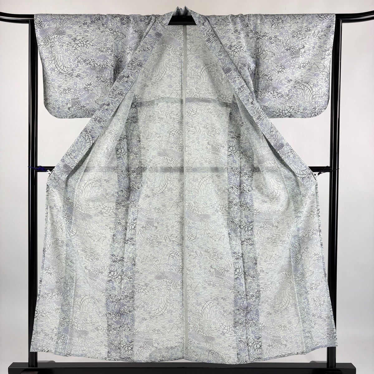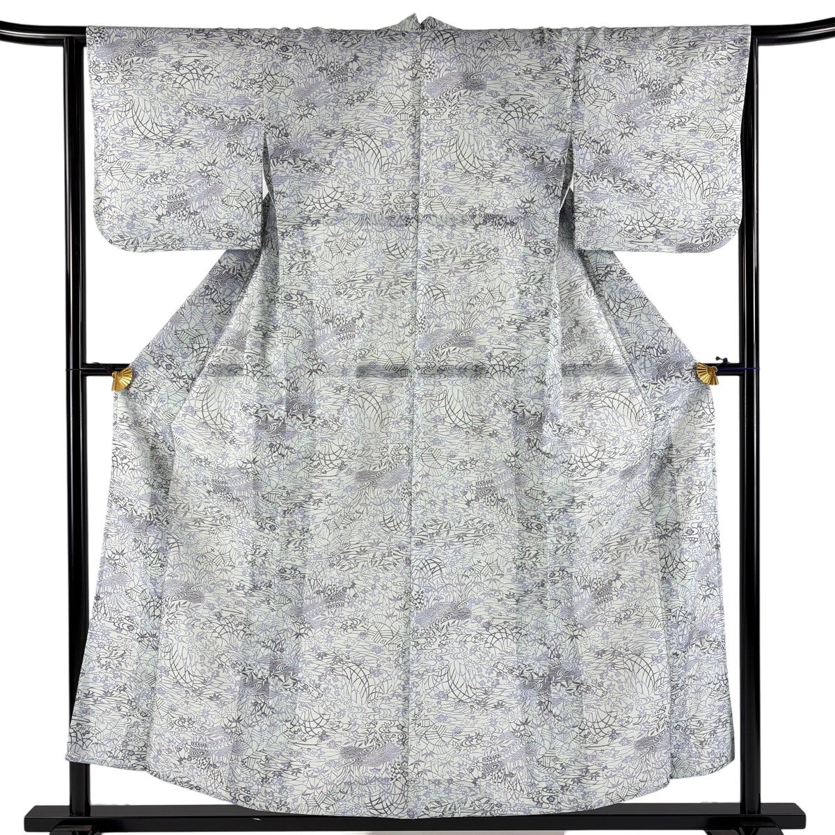 小紋 身丈164cm 裄丈62.5cm S 単衣 草花 紗綾形 青灰色 正絹 秀品