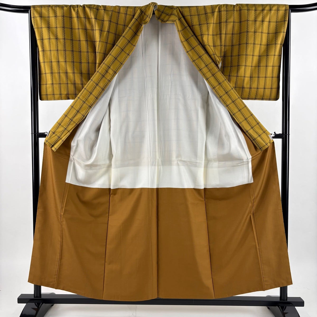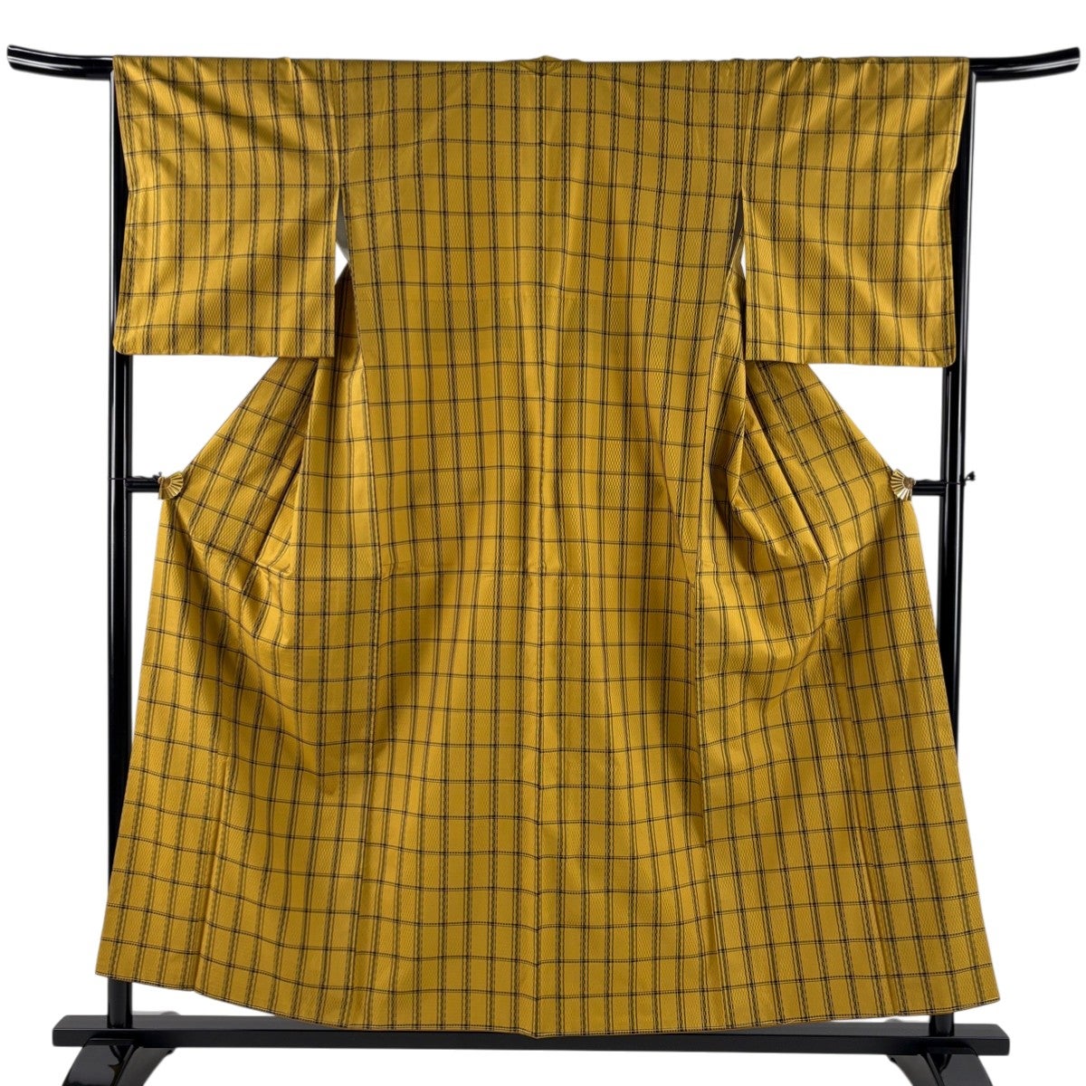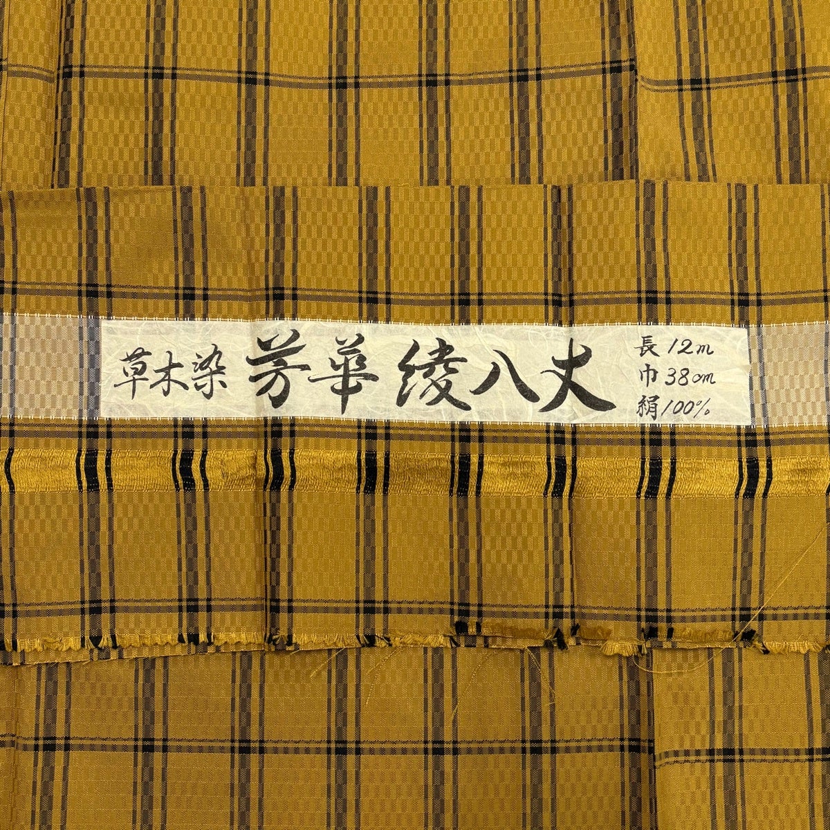【美品】 紬 身丈155.5cm 裄丈66cm M 袷 芳華綾八丈 格子 草木染 黄土色 正絹 逸品