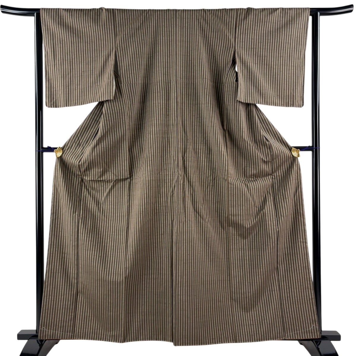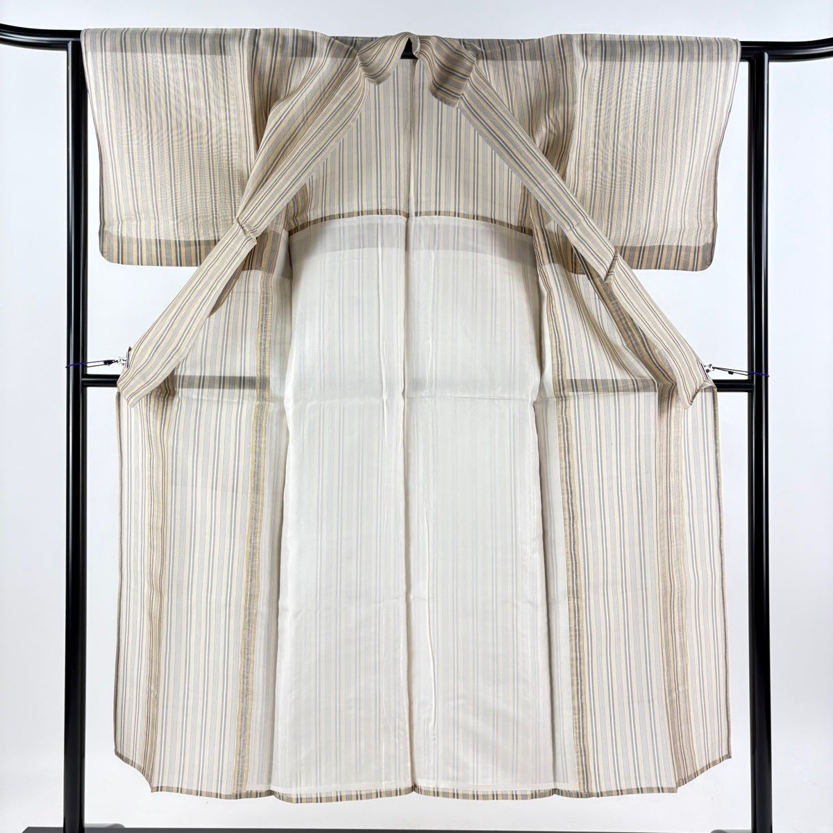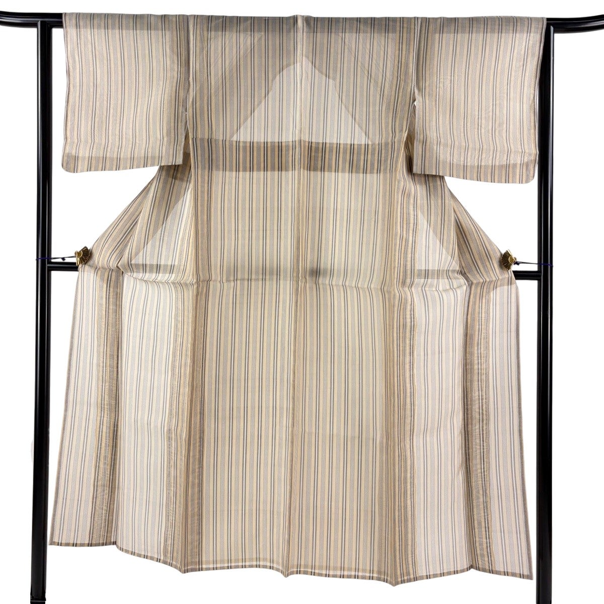 【美品】 紬 身丈150.5cm 裄丈62.5cm S 薄物 夏紬 縦縞 ベージュ 正絹 名品
