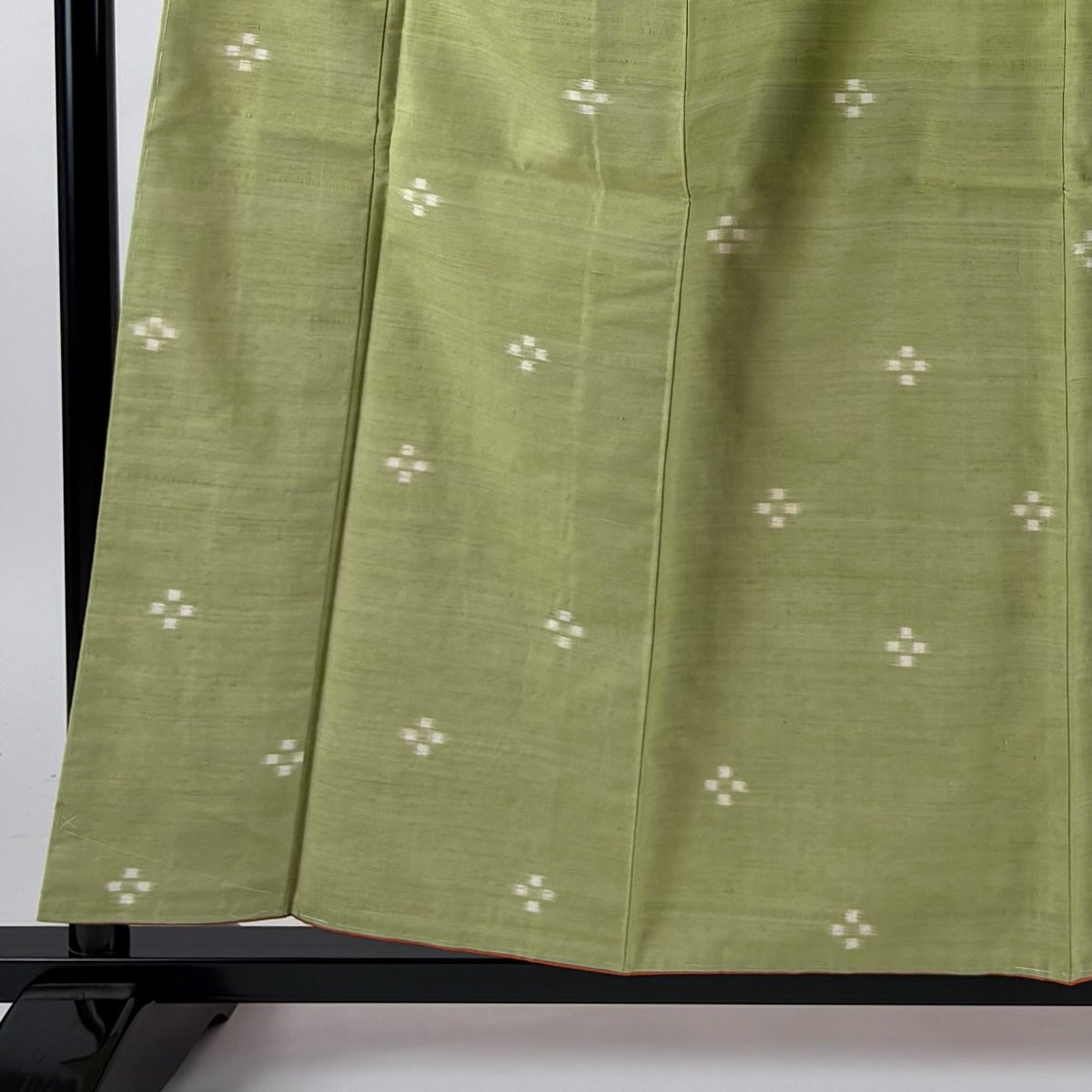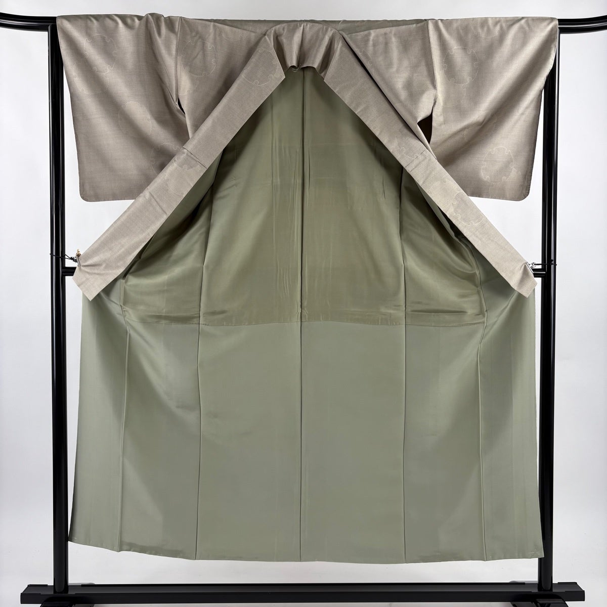 【美品】 小紋 身丈152.5cm 裄丈63cm S 袷 柿本市郎 落款あり 草花 地紋 灰緑 正絹 名品 一つ紋