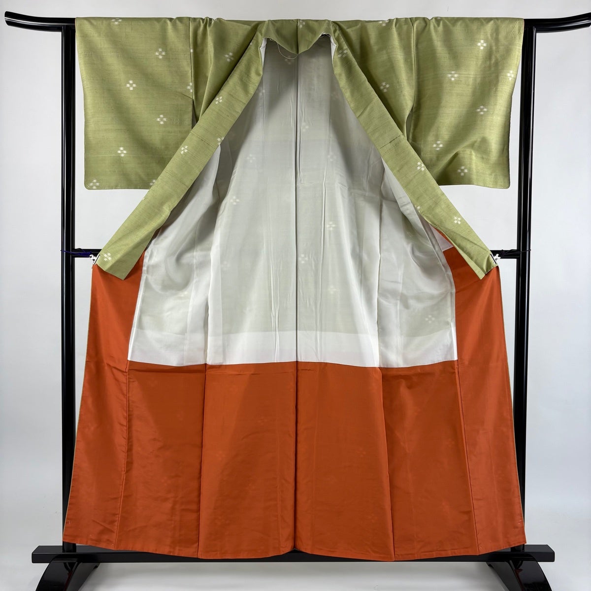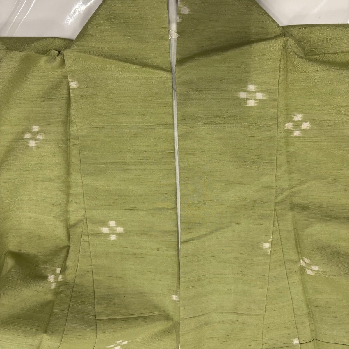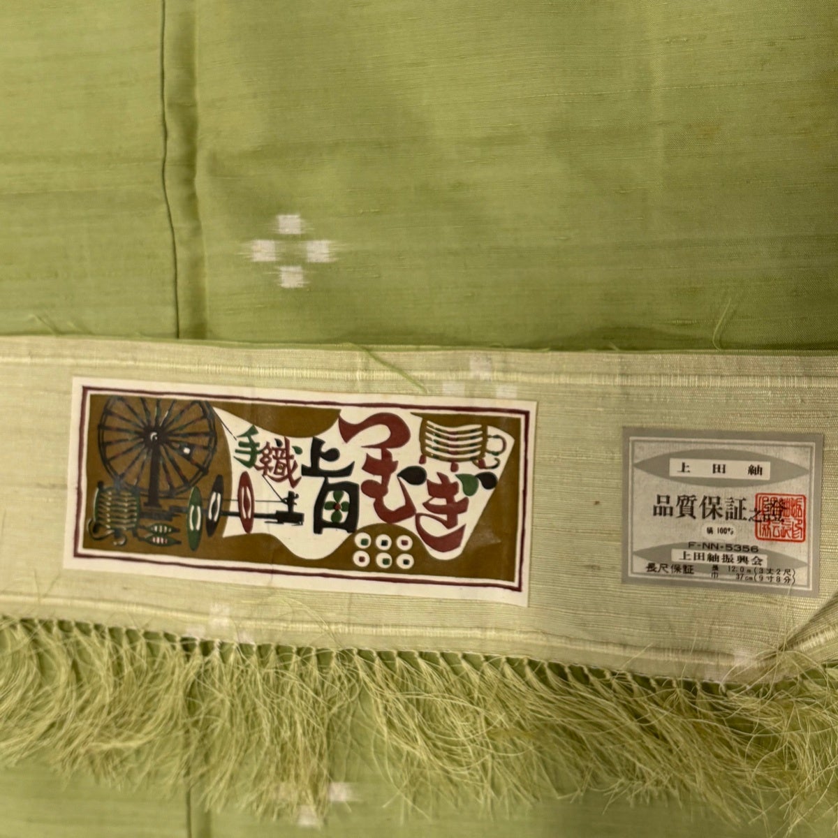紬 身丈158.5cm 裄丈64cm M 袷 上田つむぎ 証紙あり 花 よもぎ色 正絹 秀品