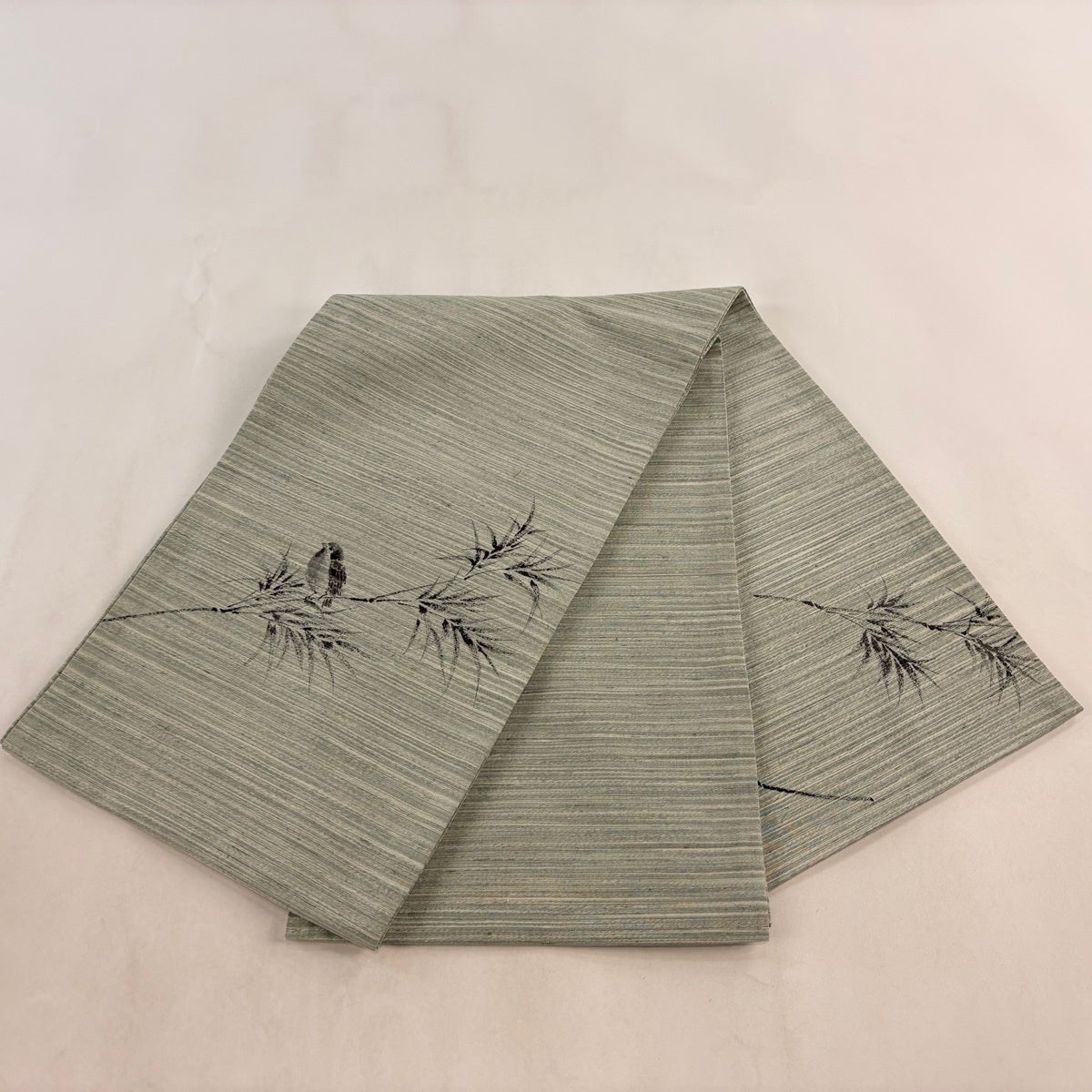 【美品】 袋帯 秀品 紬地 草花 鳥 よもぎ色 六通 正絹