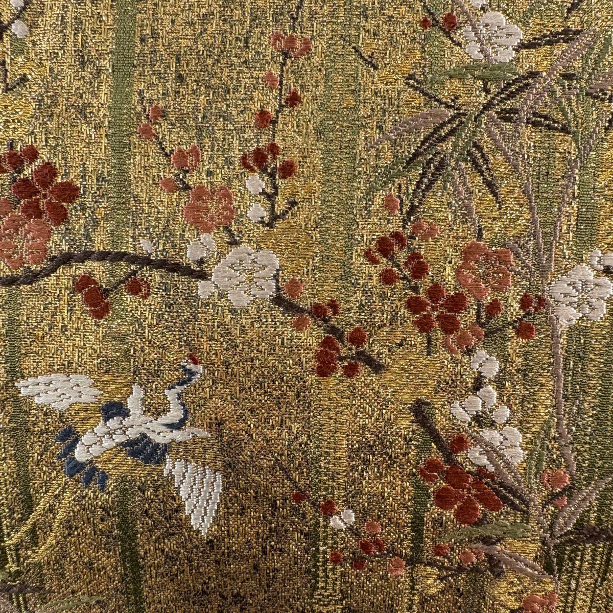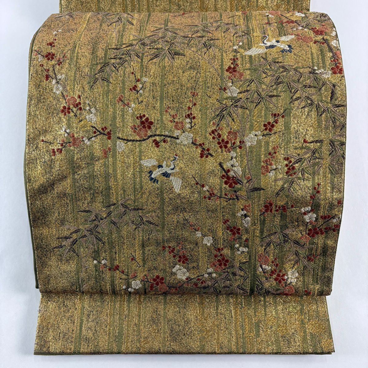 【美品】 袋帯 秀品 関西仕立て 草花 鶴 金糸 箔 金色 六通 正絹