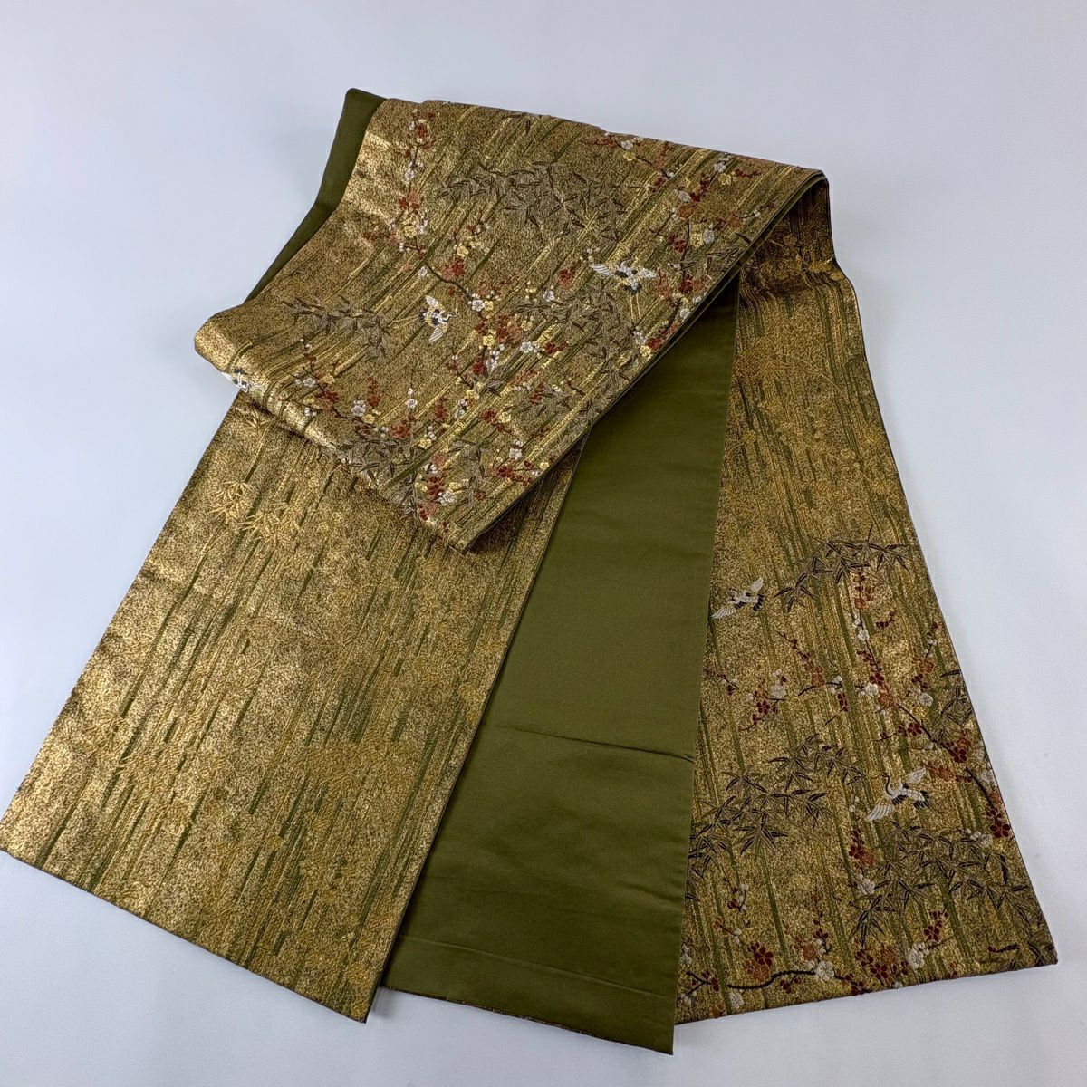 【美品】 袋帯 秀品 四季彩花 草花 鶴 金糸 灰緑 六通 正絹