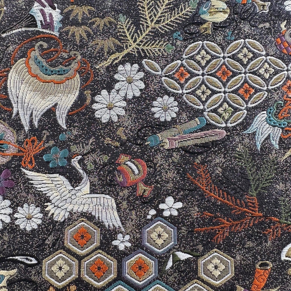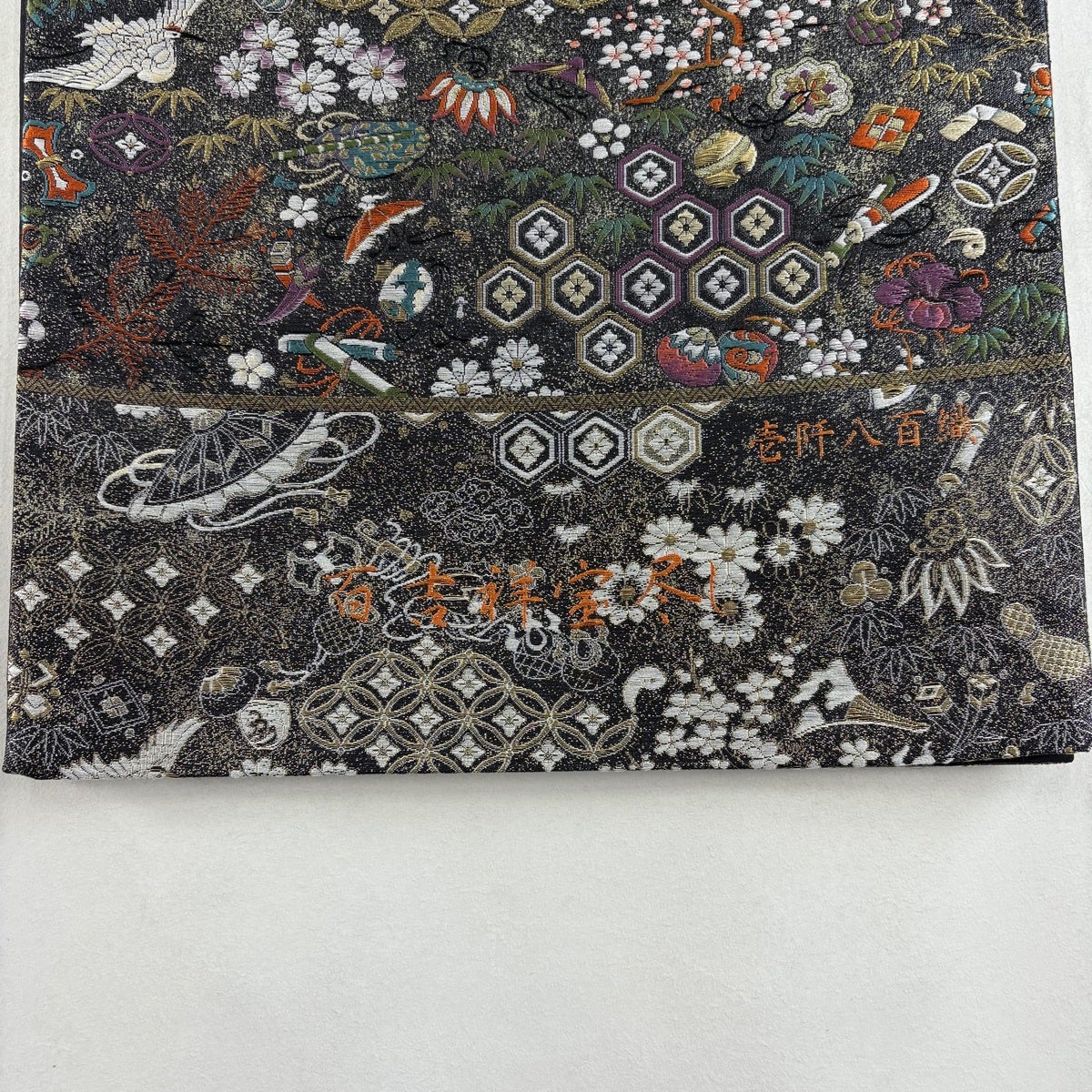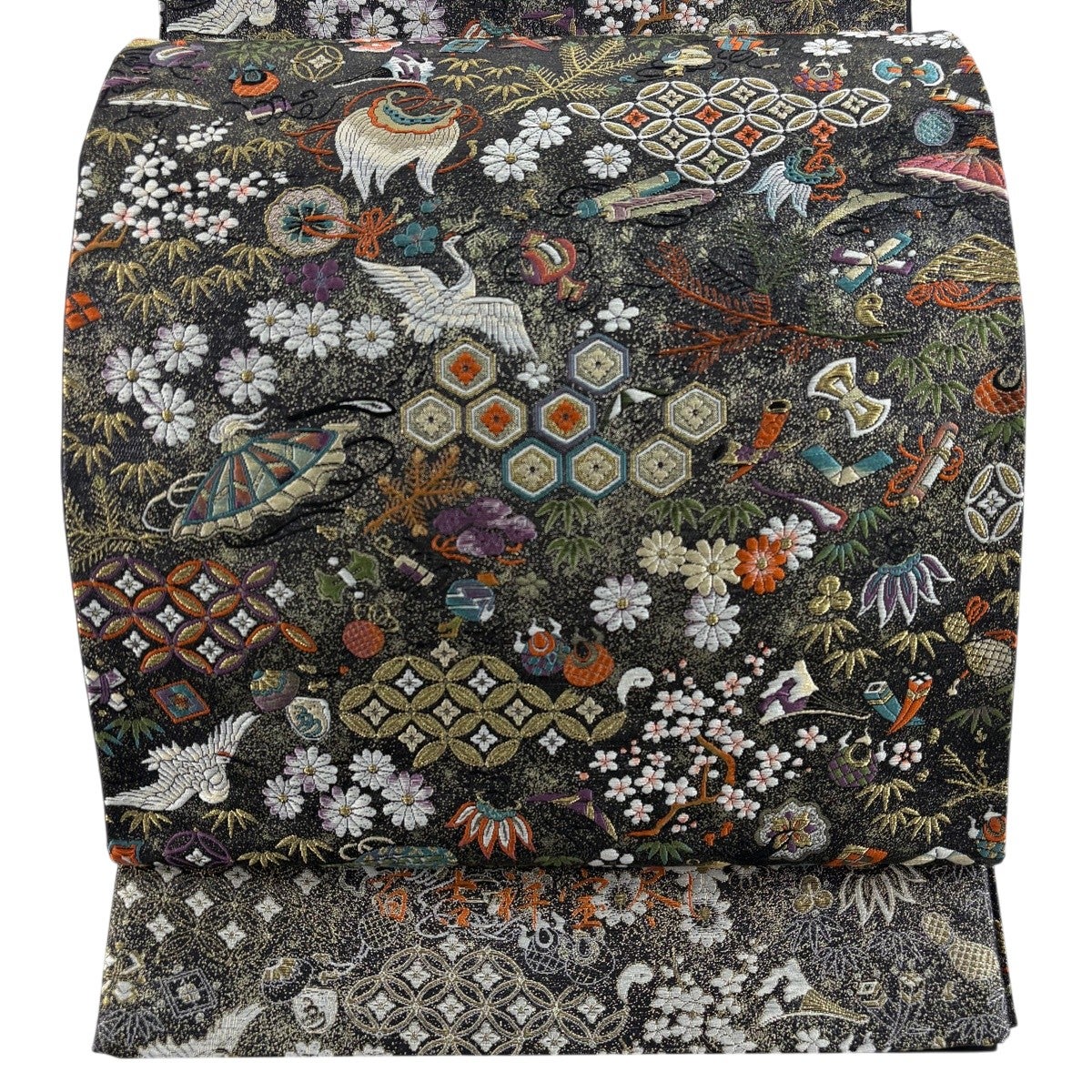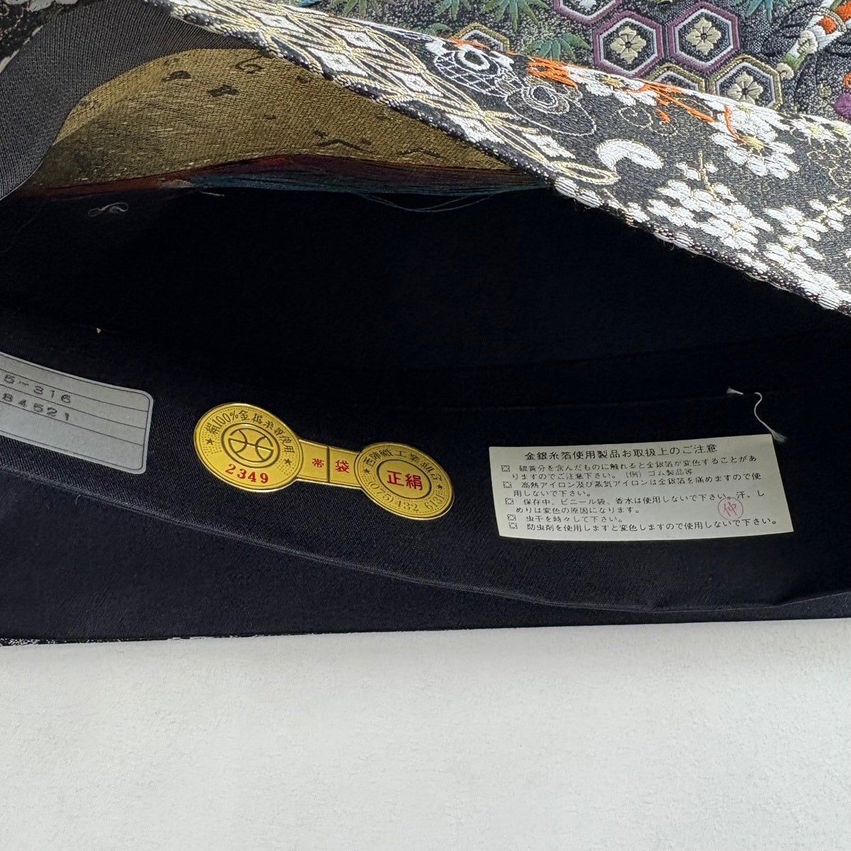 【美品】 袋帯 名品 証紙あり 宝尽くし 鶴 箔 黒 六通 正絹