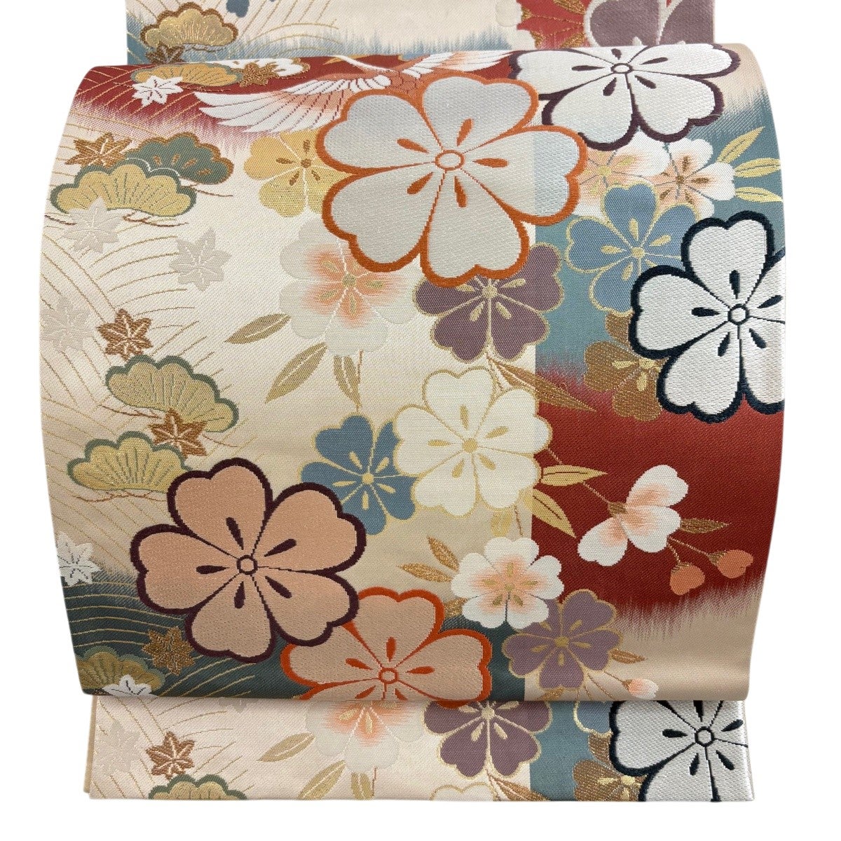 【美品】 袋帯 秀品 桜 鶴 刺繍 箔 ベージュ 六通 正絹