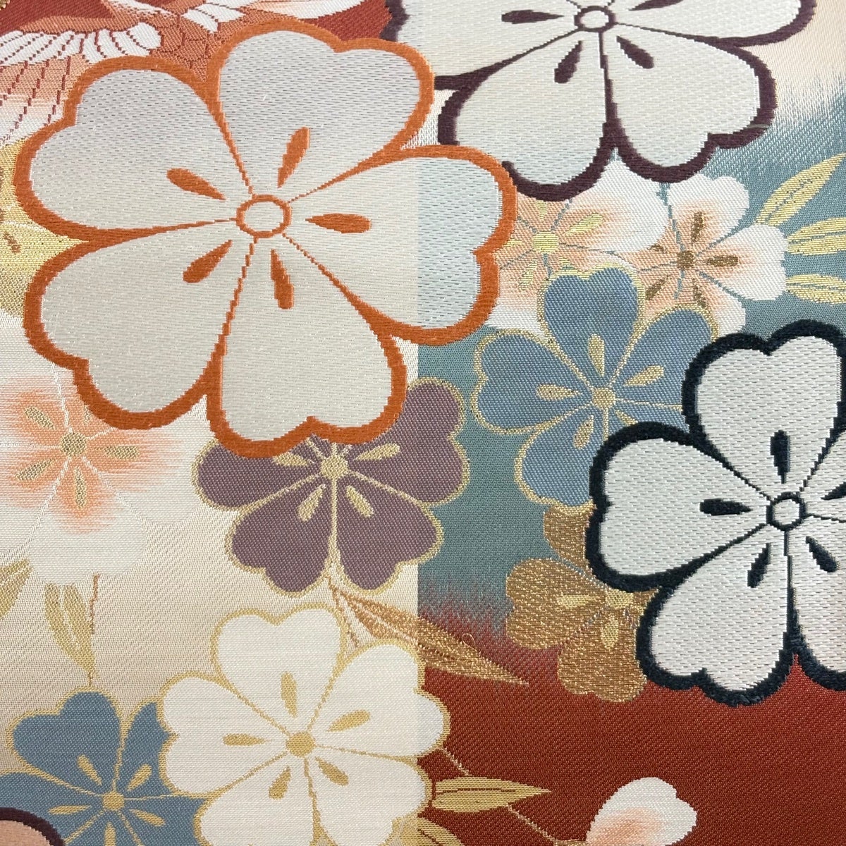 【美品】 袋帯 秀品 草花 鶴 箔 金銀糸 薄オレンジ 六通 正絹