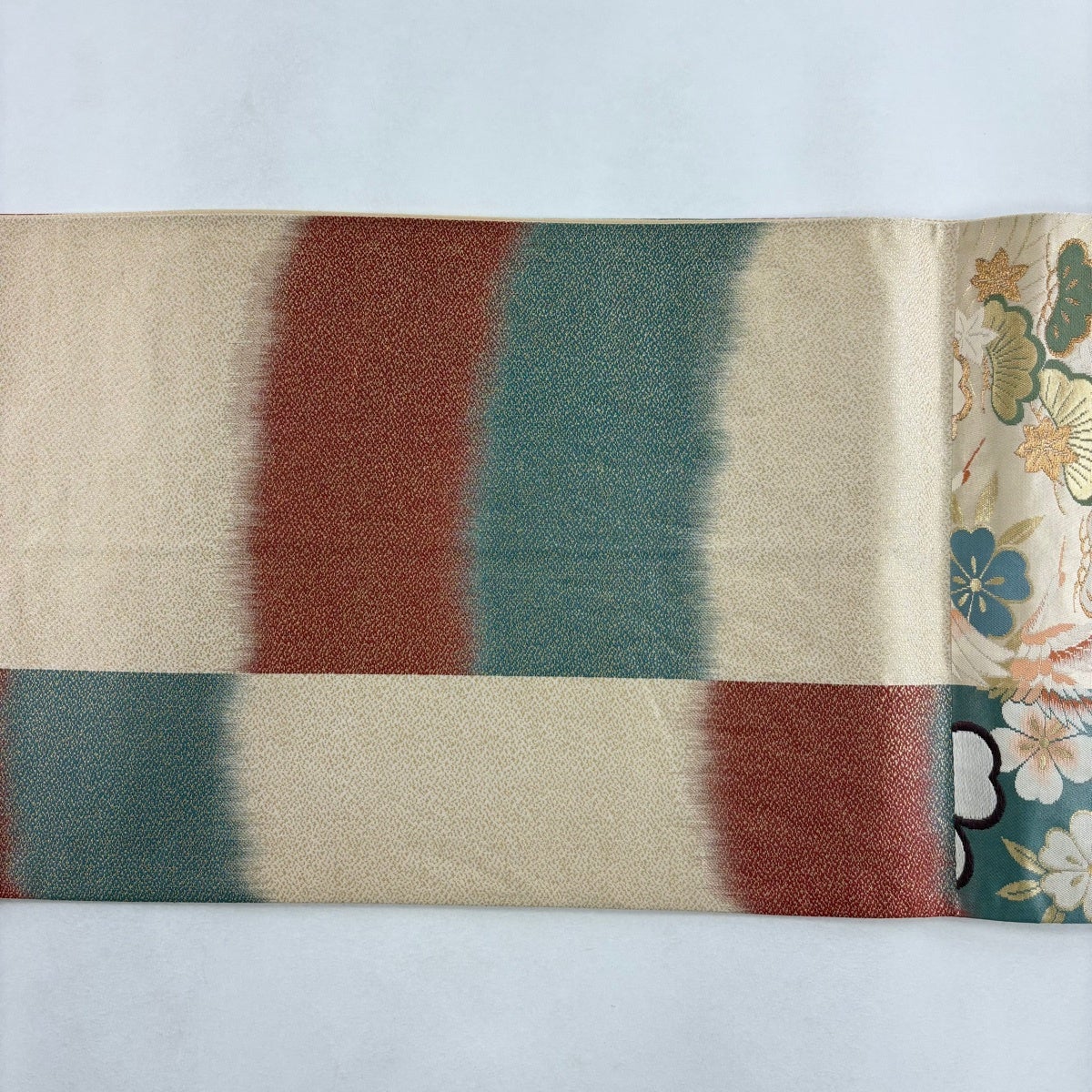 【美品】 袋帯 秀品 鶴 草花 唐織 箔 ベージュ 六通 正絹